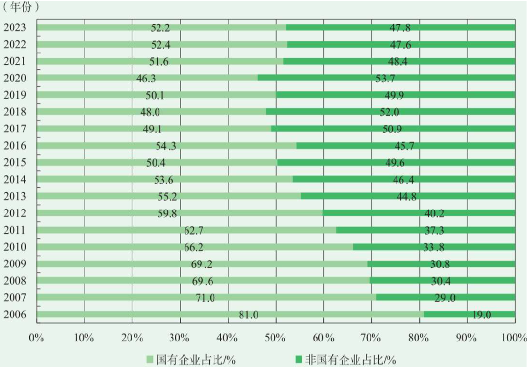 图二:2006-2023年中国国有企业和非国有企业投资存量占比情况