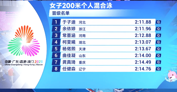 全运会女子200米个人混合泳:13岁于子迪总排名第一晋级决赛