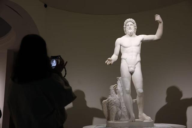 走进展厅,2.27米高的宙斯(朱庇特)雕像是观众看到的第一件重要藏品。雕像以一种对立平衡的姿态站立,左臂举起,右侧的鹰是他的另一个特征。在历史上,罗马神话在吸收希腊神话核心神祇体系、故事框架的基础上,对神祇进行本土化改造,并融入罗马自身的宗教信仰、社会文化与价值观念,形成同源异流的神话体系。策展人孙怡介绍,为了便于观众理解,此次展览的所有神祇,均同时标注希腊神名与罗马神名,比如宙斯对应朱庇特、雅典娜对应密涅瓦等。