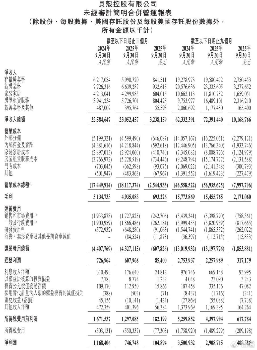 贝壳2025年第三季度净利润为7.47亿元(1.05亿美元),经调整净利为12.86亿元(约1.81亿美元)。