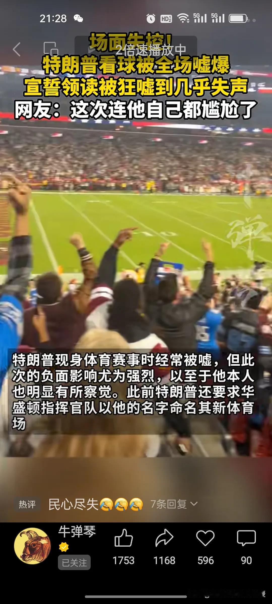 看来特朗普确实要兑现给3亿美国人发2000美元关税钱才能挽回民心了。昨天特朗普去看橄榄球赛,当大屏幕出现特朗普的样子时,现场球迷一片嘘声,到了宣誓环节,特朗普读誓词时候,场上再次被嘘声淹没,没人服特朗普,特朗普现场尴尬得不行,可是还得坚持把誓词读完。 美国政府停摆,特朗普还在海湖庄园接连搞派对狂欢,军饷发不出,4200万美国人等救济,他还花3亿美元拆白宫东翼建宴会厅,700万美国人上街抗议,他却发恶搞视频像民众投放泥浆炸弹......这些令人咋舌的举动,实在让民众对特朗普尊敬不起来,此次特朗普看比赛被全体球迷用嘘声抗议,看来特朗普只能尽快兑现给民众发钱才能挽回口碑啊!