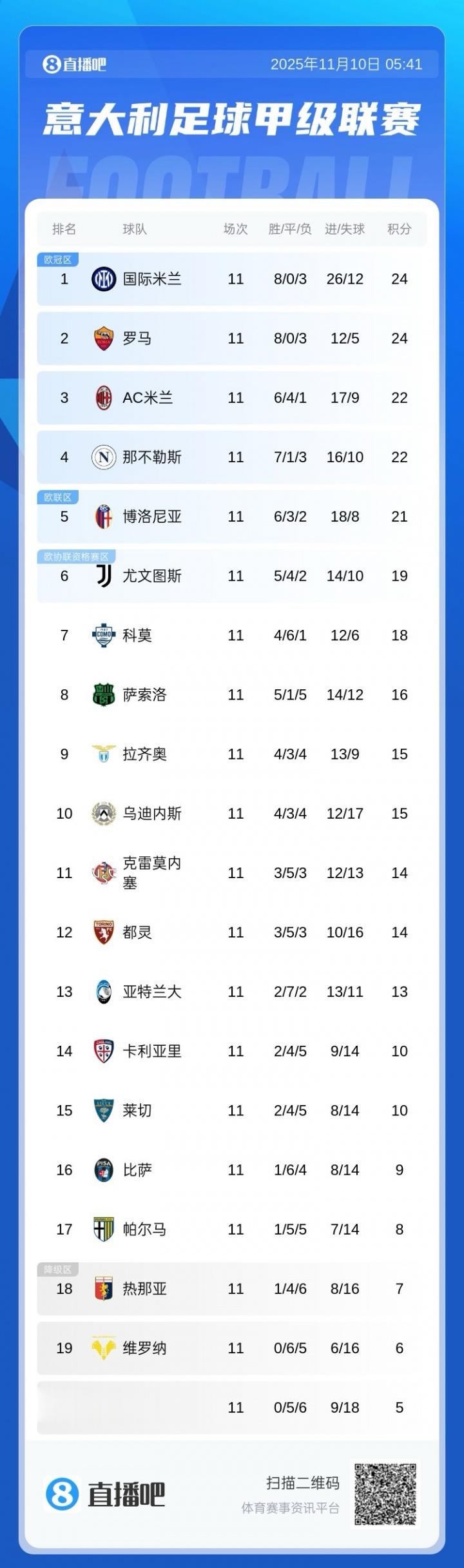 直播吧11月10日讯本赛季意甲11轮战罢,国米与罗马同积24分位列积分榜前两位。