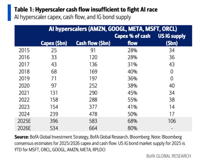 策略师MichaelHartnett在报告中写道,对亚马逊(AMZN.US)、谷歌(GOOGL.US)、Meta(META.US)、微软(MSFT.US)和甲骨文(ORCL.US)等超大规模科技公司而言,其现金流已不足以支撑当前这场“AI资本支出军备竞赛”。