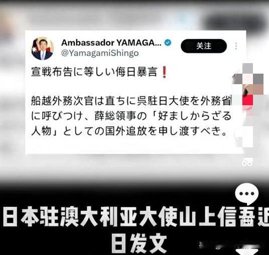 跳梁小丑,不知所谓 日本驻澳大利亚大使山上信吾,今天发表了令人震惊的言论:“侮辱日本等同于宣战!”山上信吾大使,一定不知道当今的世界格局,不允许任何国家,做出与“宣战”相等的举动。 他一再要求,外务副大臣船越召见吴江浩大使,并驱逐薛剑总领事出境。理由居然是:“捍卫日本荣誉!”山上大使不愧是日本政客,说出的话,做出的反应,一点都不心虚。 相比之下,中国驻大阪总领事薛剑,回应吴江浩大使时,说出“日本一些政客的反应很激烈,我们认为这很正常,很好理解!”这番话说得滴水不漏,回应得合理合法,正当得不能再正当,显示出大国捍卫国家主权,不屈不挠的坚决态度和原则! 也难怪山上信吾大惊小怪,说出“侮辱日本等同于宣战”的狂言。毕竟,与吴江浩大使,面临尴尬境地的,还有澳大利亚当局。 原本这只是两国当局间,外交官的正常举动。没想到,日本某些政客,见到大国当局及外交官,居然如此“心虚”,反应如此激烈,完全不顾及澳大利亚当局和人民的感受和立场。 明明,是你日本某些政客,挑起的,是你们破坏了两国关系发展的良好势头,是你们不断地污蔑和抹黑大国,才导致两国关系紧张的局面。 既然如此,为什么日本某些政客,不向澳大利亚当局和人民,解释清楚这番话的真实意思?而是,让山上信吾大使,用这种“侮辱日本等同于宣战”的狂言,来掩饰心虚? 这充分说明,山上信吾大使,不是大国人民的朋友,而是心虚之小人,既然如此,那大国人民,就让你小人心虚得彻底!请记住:中国的领土,不可分割! 山上信吾其实早有反华前科,2021年就美化二战罪行被中国大使当场痛斥,现在又拿“宣战”碰瓷,纯属老调重弹博眼球。 日本驻澳使馆前些年成了反华据点,可澳媒都看不下去,直言他是“危险盟友”,想拉澳当枪使根本没人理。 而且中国现在国防实力早不是百年前,航母列装、海警巡航常态化,真要动真格,日本那点威慑论就是纸糊的老虎。 日本嘴上喊着捍卫荣誉,实则在台湾问题上乱伸手,这种踩着别人主权刷存在感的操作,只会让国际社会看清日本的真实面目。 评两句 山上信吾一会儿美化二战一会儿喊宣战,怕是忘了日本现在连交战权都受和平宪法限制,纯属装腔作势。 中方外交官护主权天经地义,日本倒先跳脚要驱逐,这逻辑就像自己闯了祸还怪别人拦着,太可笑了!
