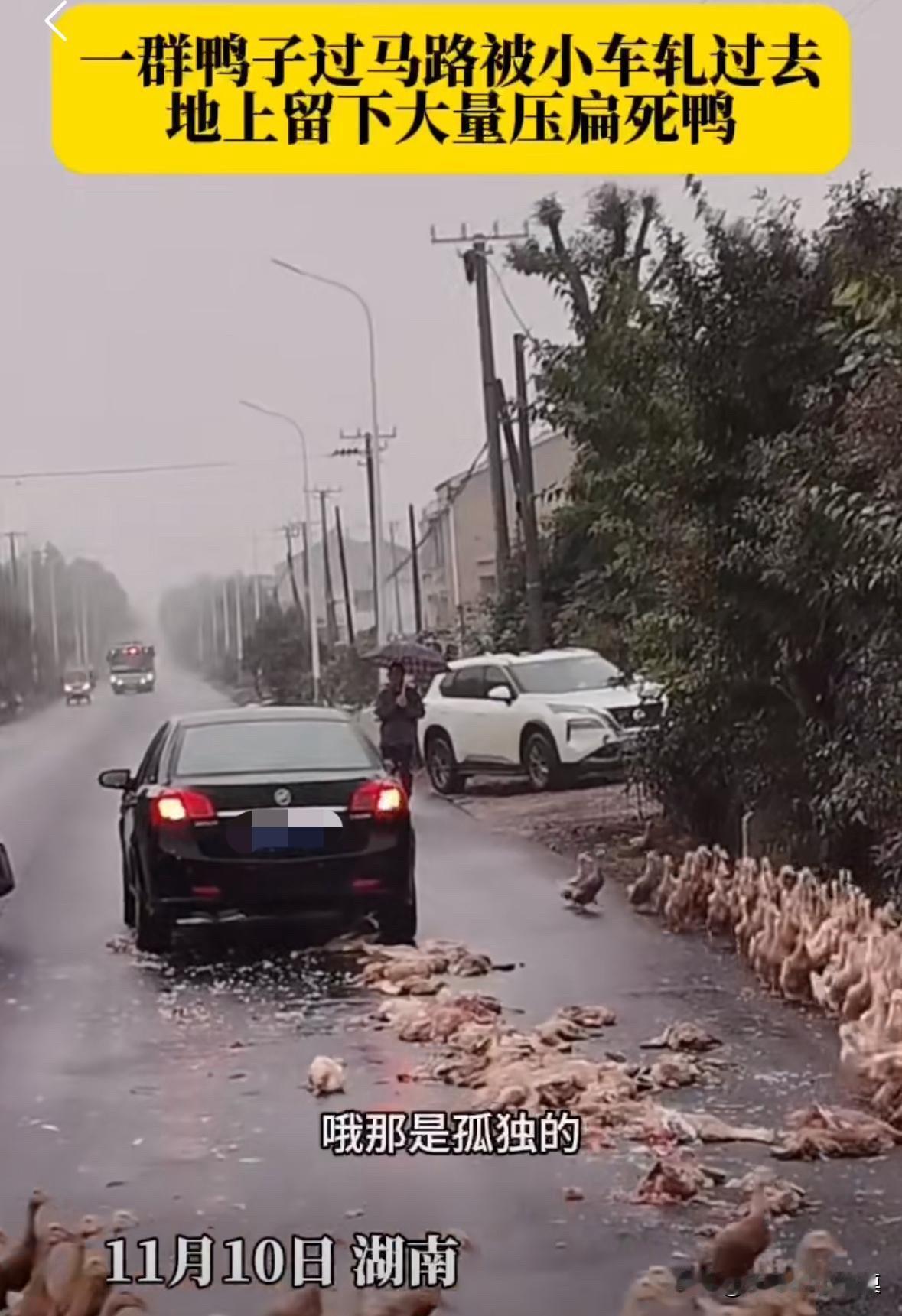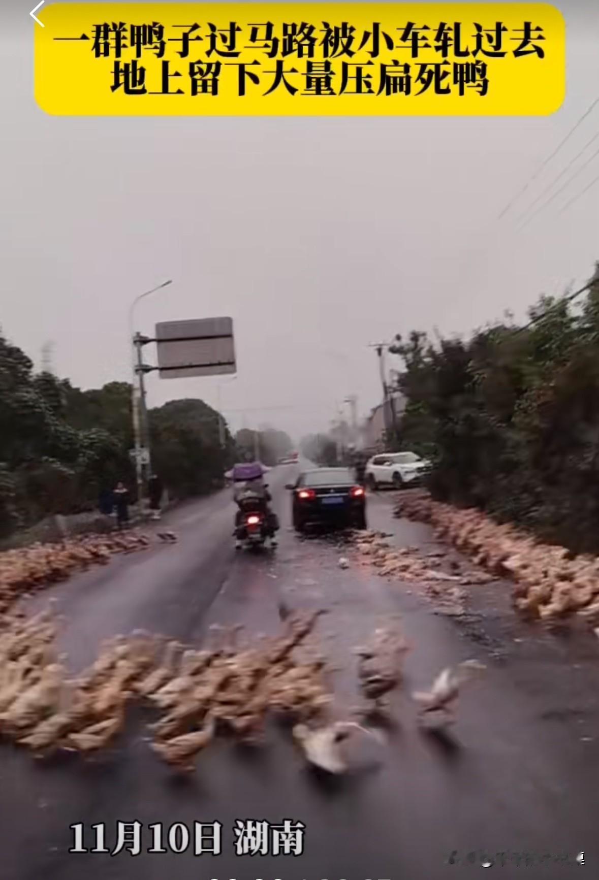 一群鸭子过马路,一辆小轿车驶过来并没有减速,直接压死了很多鸭子! 这些鸭子直接就被压扁了,太残忍了! 我想说,这位车主你是不是瞎啊,这么多鸭子你看不到。 没办法,赔钱了,这种路都敢开这么快,也是服了。马路上鸭子