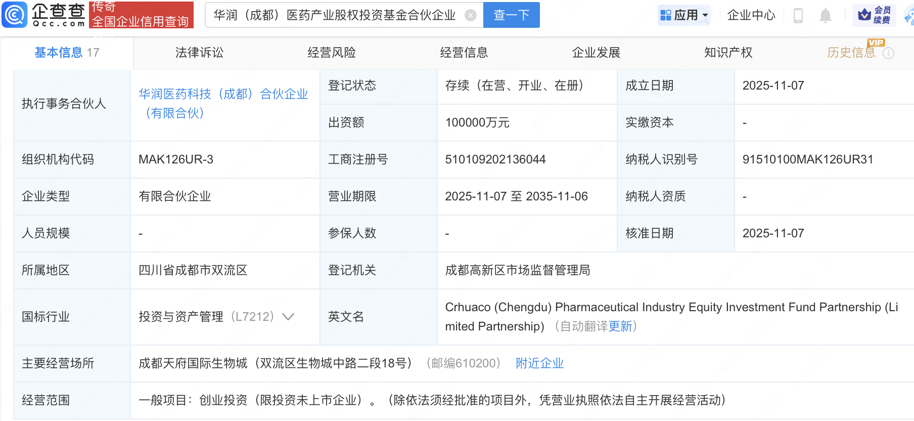 企查查APP显示,近日,华润(成都)医药产业股权投资基金合伙企业(有限合伙)成立,出资额10亿元,经营范围包含:创业投资(限投资未上市企业)。企查查股权穿透显示,该企业由复星医药(600196)全资子公司上海复星医药产业发展有限公司、东阿阿胶(000423)、博雅生物(300294)、华润双鹤(600062)、江中药业(600750)等共同出资。