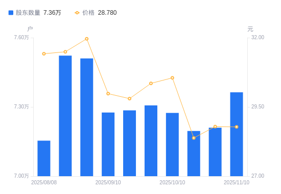 日期A股户数(户)流通A股户均持股数(股)户均持股市值(万元)2025-11-107363311155.5232.112025-10-317210011392.7132.802025-10-207195611415.5132.402025-10-107274011292.4734.502025-09-307306511242.2434.122025-09-197285011275.8133.602025-09-107275811290.0733.852025-08-297510010937.9934.962025-08-207522310920.1034.392025-08-087154011482.2936.08
