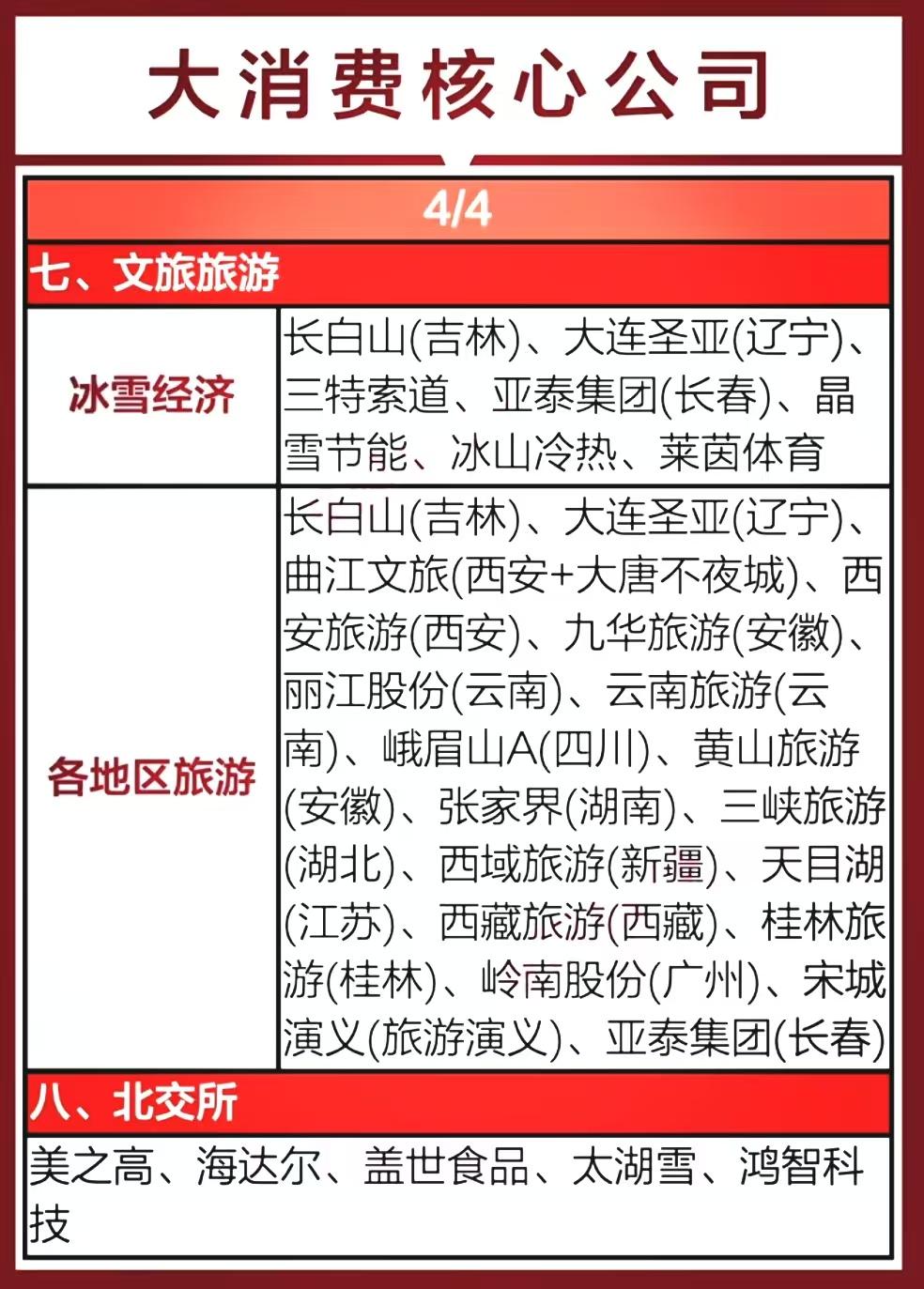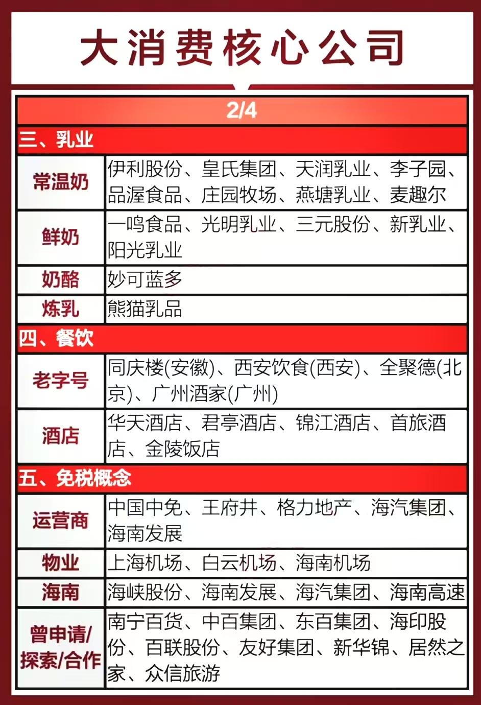 大消费题材八大分类龙头梳理 政策利好,11月7日财Z部发布将继续实施好提振消费专项行动,对重点领域的个人消费贷款和相关行业经营主体贷款给予财政贴息,利好消费题材概念,大消费题材包括食品饮料、文化旅游、免税概念、冰雪经济、餐饮零售等等。相关概念龙头有哪些? 餐饮百货:西安饮食、国光连锁 乳业饮料:东鹏饮料、伊利股份 冰雪经济:大连圣亚、冰山冷热 文化旅游:云南旅游、西安饮食 百货零售:南京新百、王府井 免税概念:中国中免、海汽集团 理财有风险入市需谨慎!资料取材网络仅供参考不能作为投资依据。大消费概念股 新消费概念股