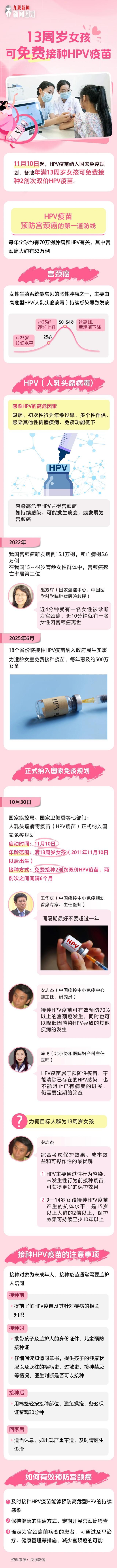 2025年11月10日起,各地为2011年11月10日以后出生的满13周岁女孩免费接种2剂次双价HPV疫苗(间隔6个月)。