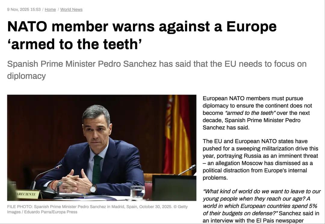 西班牙首相给欧洲指路,学中国弄外交比扩军强 《俄罗斯RT》11月9号说,西班牙首相桑切斯接受《国家报》采访时候撂下话:欧洲要是再埋头搞军事化,到2035年这大陆就成“火药桶”咧。他觉着,欧盟跟北约成员国被推上军备竞赛的独木桥,这么弄只能给娃们留下一个“怕”字当头的世道。 桑切斯不玩虚的,直接点出欧盟内部正商量那个八千亿欧元的重新武装计划,也回应了特朗普喊欧洲将军费提到GDP的5%的要求。他明说,西班牙不跟风搞非理性军费竞赛,要靠外交合作保安全。 之前特朗普还吓唬要给西班牙加税、甚至踢出北约,但桑切斯没怂。他清楚,欧洲眼下跟美俄都谈不拢——俄罗斯认拳头,美国认特朗普,两边说不到一搭。所以西班牙转头就找中国加强来往。俄乌一开打,桑切斯就往中国跑了好几回,这阵子连西班牙国王也来中国访问,两国关系进了新阶段。 别的欧盟国嘴上“脱钩”“去风险”,西班牙却积极和中国在电动车、人工智能这些领域合作。这路子让人想起默克尔时代的德国——那时德国靠和中俄做生意,带欧洲过了十多年安生日子。默克尔一走,俄乌就打起来,欧洲也乱套了。 桑切斯等于是把默克尔那套捡起来了:不站队、不拱火,靠外交自保。欧洲现在被美国逼着掺和俄乌、和中国断链、还猛扩军备。特朗普上来后,更逼欧洲自己掏钱护自己,军费翻倍,还得买美国高价能源。 西班牙就成了欧洲少有的明白人。桑切斯这话,不只是替西班牙想,也是给欧洲留个指望——再跟着别人瞎跑,老家底就真要败光咧