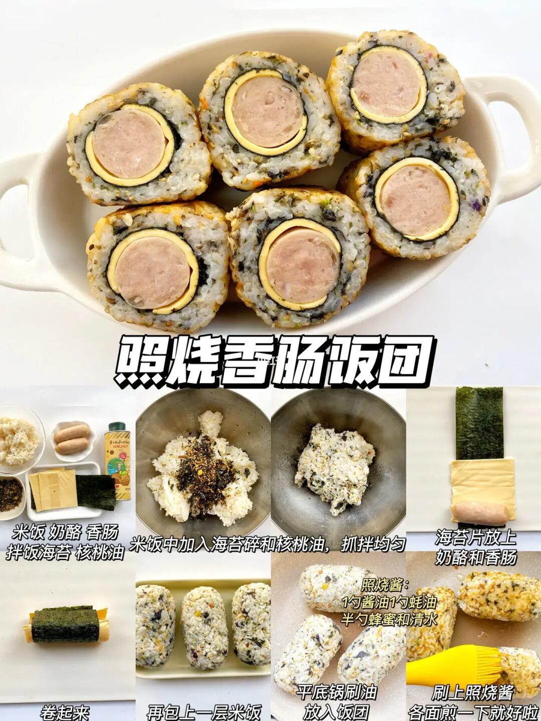 ✅饭团已经给小朋友做了好几次了,香肠、芝士、海苔拌饭这几种搭配起来,听起来就已经好好吃了,做好的饭团可以带出门,玩累了随时补充一个,营养又饱腹!