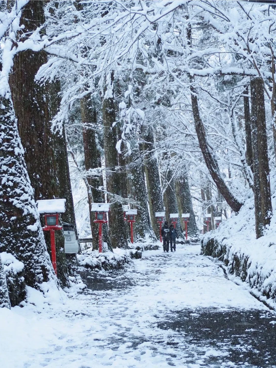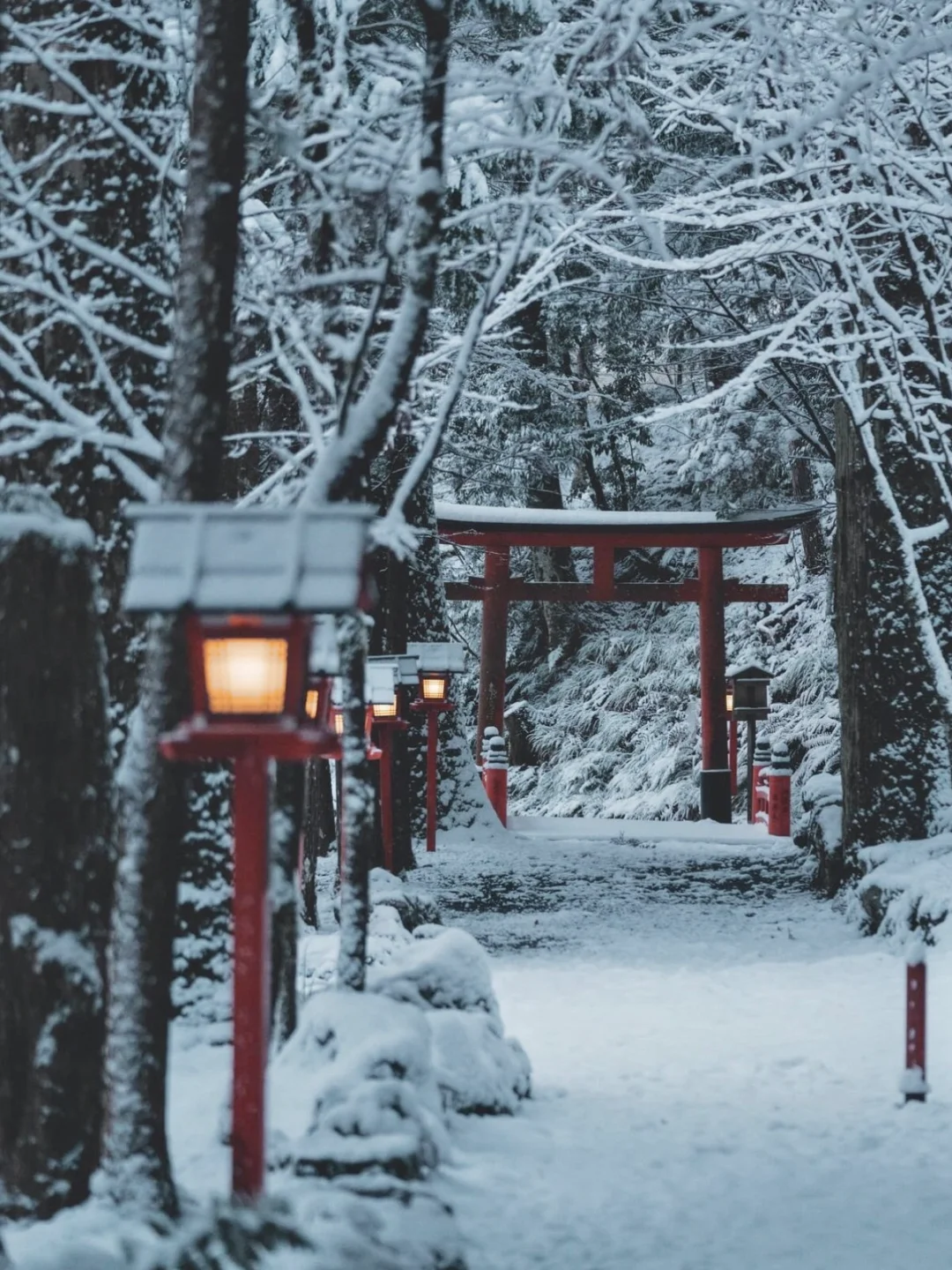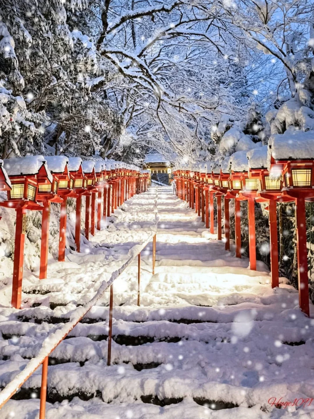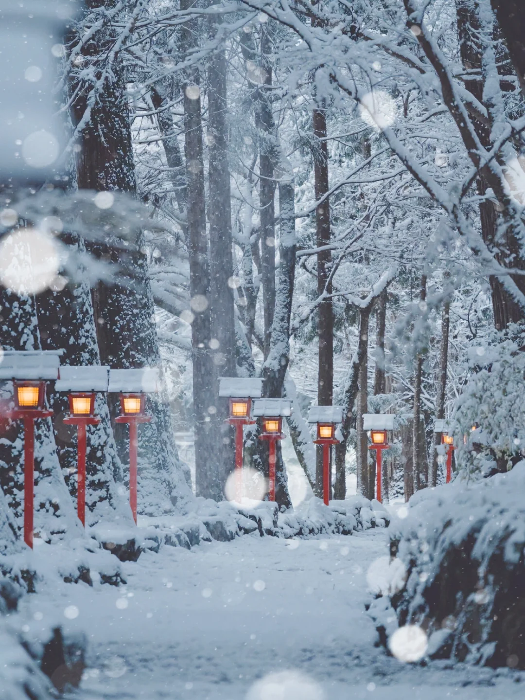 🔹冬季的贵船神社被积雪包围成银白色的冰雪世界,台阶两旁点亮的朱红灯笼在皑皑白雪的背景衬托下,显得美丽梦幻。降雪期间还有限定的“雪景点灯展”,不过点灯日期非常随机,需要随时关注官方消息