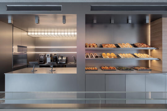 空间内原有的三根木质结构柱被设计成雕塑般的形态,与简单统一的地面石材和不锈钢体量形成对比,强化空间的层次感