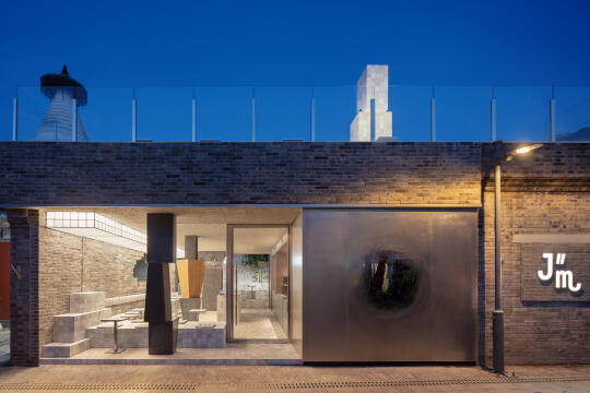 外墙设有不规则矩形窗,其随机形态吸引行人目光,形成了视觉焦点,与室内的雕塑柱相呼应和,强调了空间的统一性与雕塑感,赋予场所更强的艺术表达。