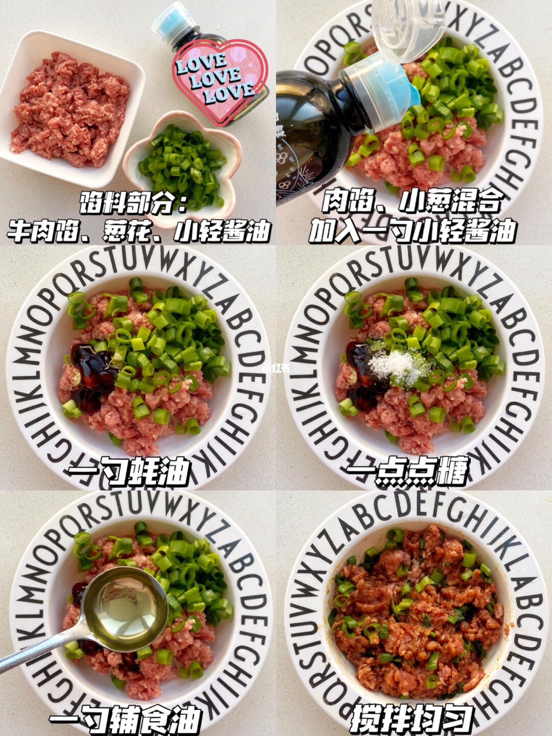 🌟肉馅我用的是牛肉馅,牛里脊肉打成泥。因为和家里小朋友一起吃嘛,所以在肉馅的调味上只用到了小轻酱油、蚝油和一点点白糖提鲜,我觉得味道已经够了。