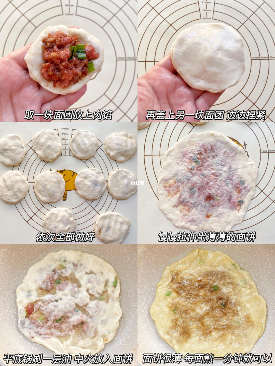 4⃣️面团醒好后,取一个小剂子按扁,放入一勺肉馅在中间,再拿一个小剂子,按扁盖上去,边边捏一下。慢慢扯成薄薄的饼,醒好的面团延展性好。