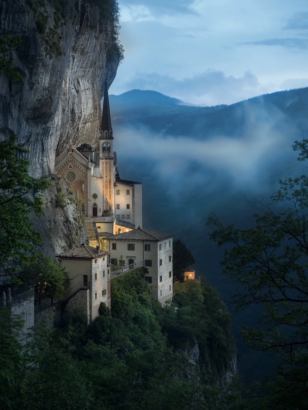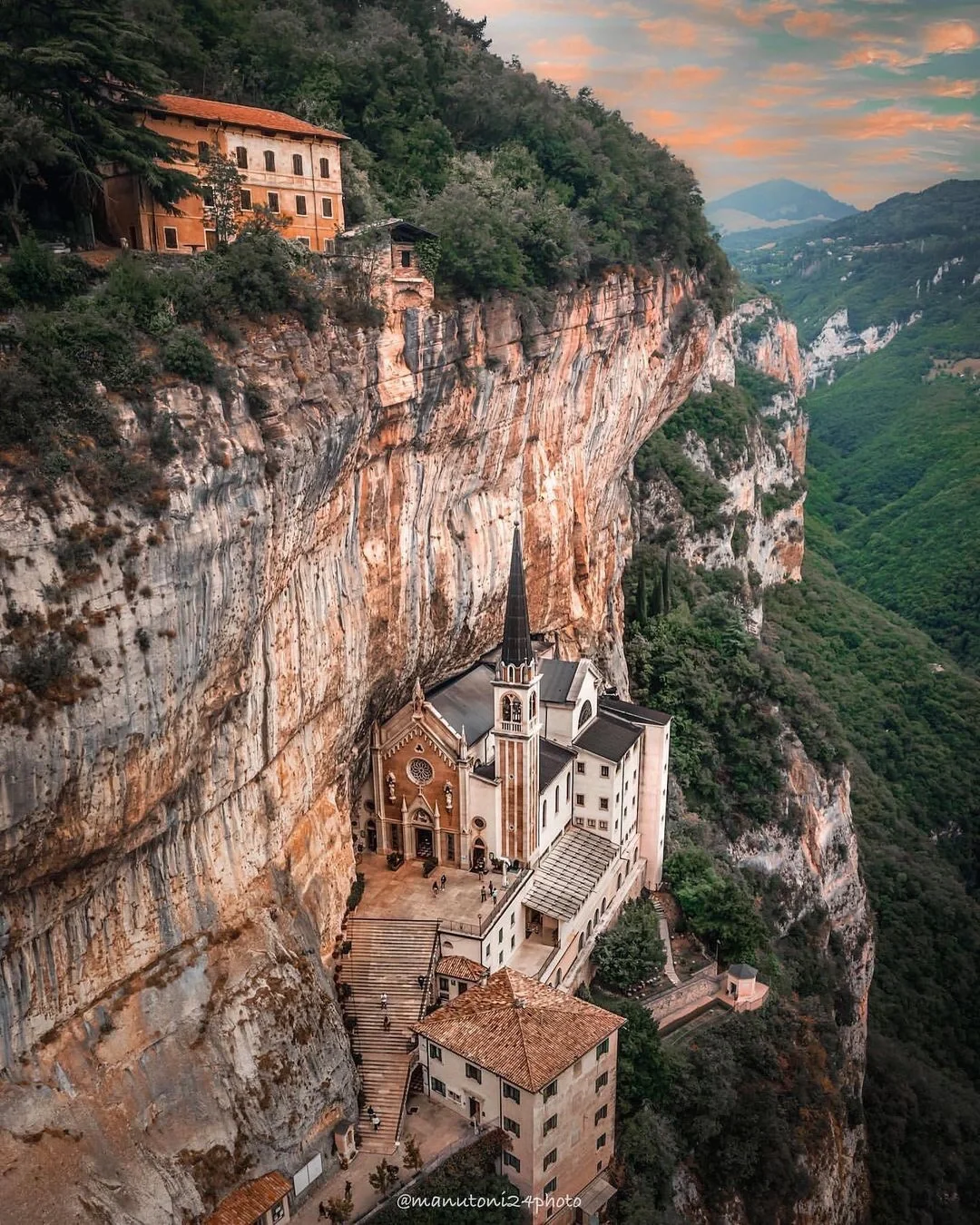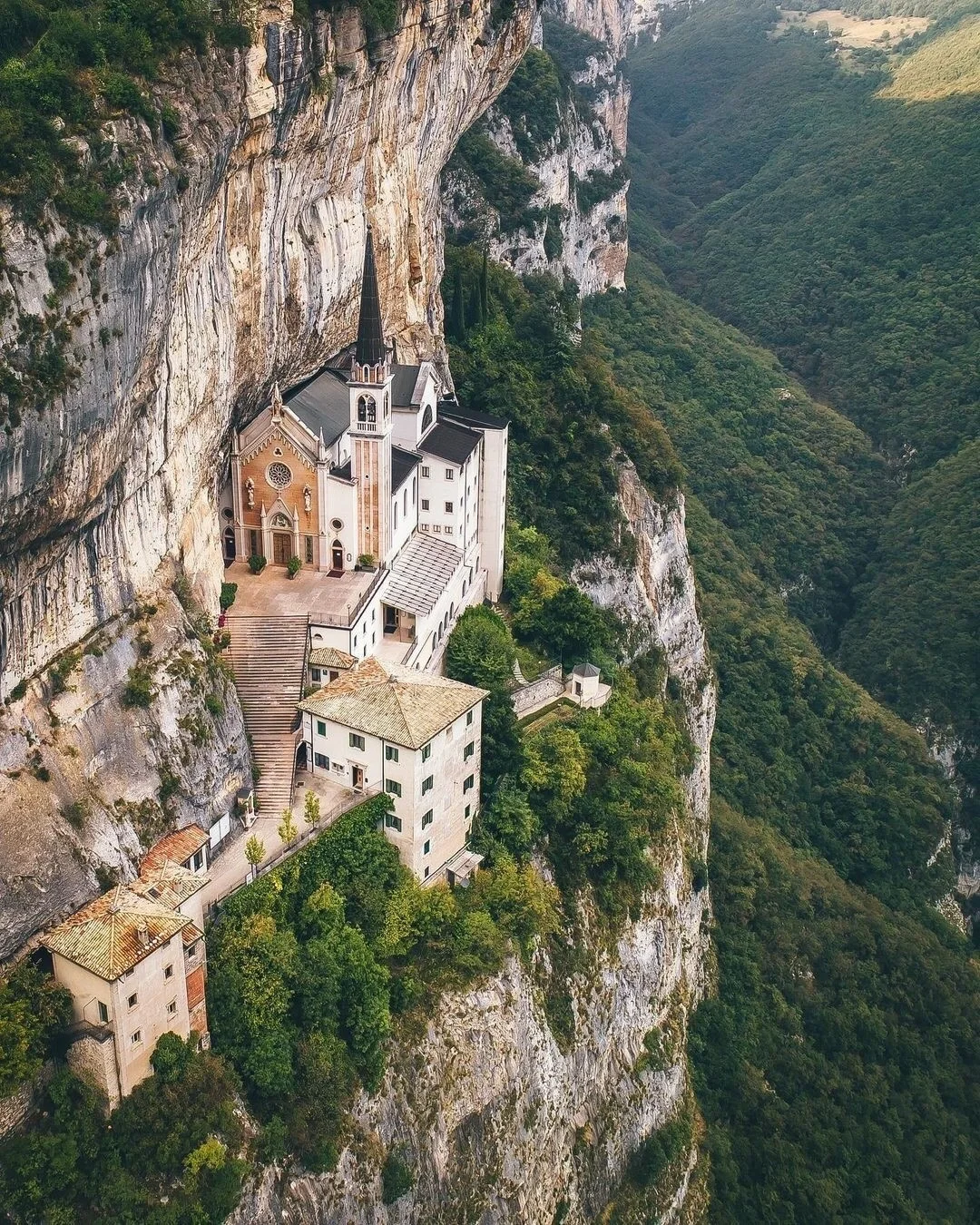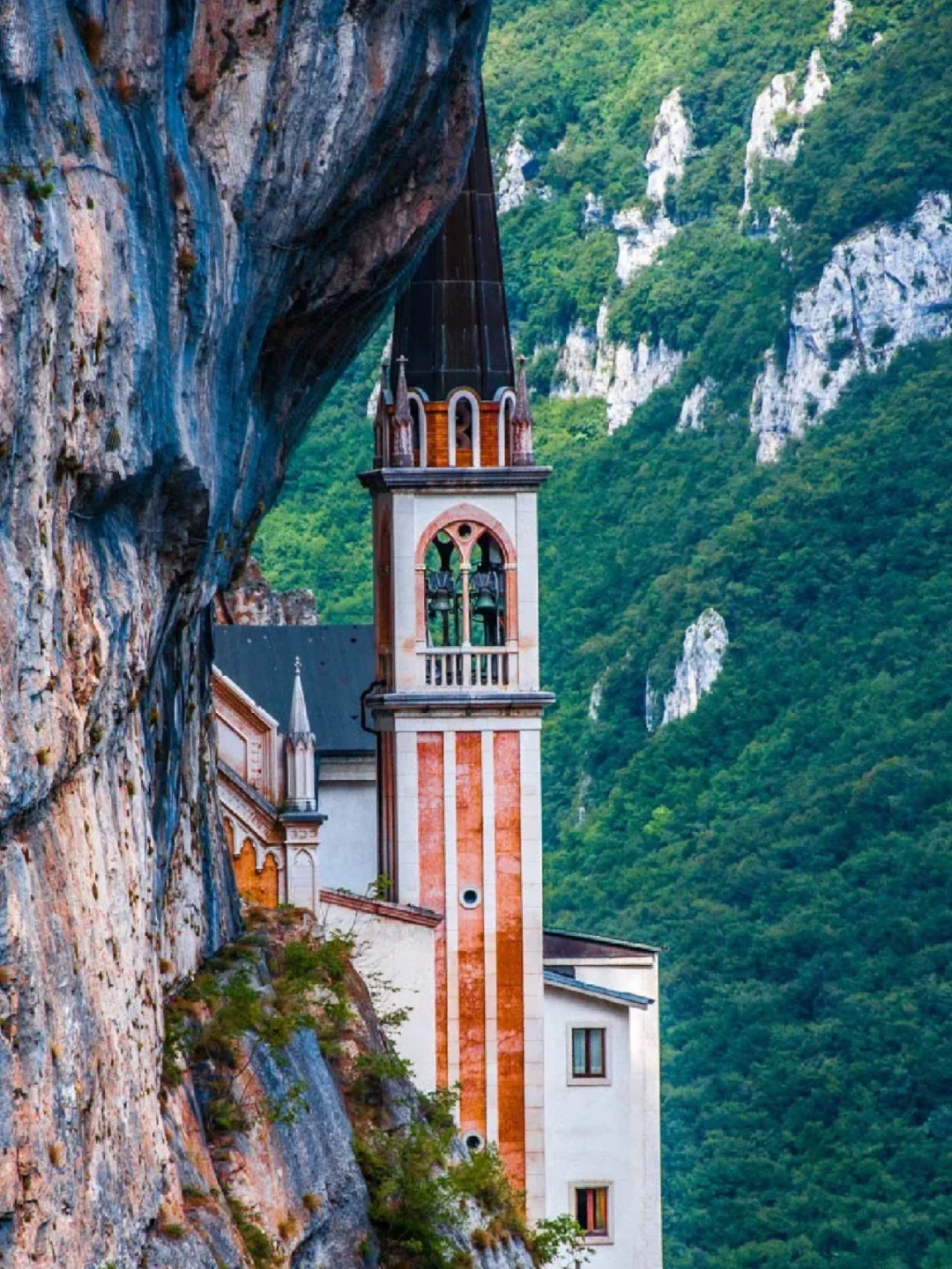 意大利Madonna della Corona是一座引人注目的教堂,因为它半凿在岩石中,似乎悬浮在天地之间。哥特式外墙呼应着山上郁郁葱葱的绿色,头顶蓝天,还能听到钟楼里的钟声,旋律好像可以飞过山谷,冲天而去。瞬间让人鸡皮疙瘩一身,肃然起敬!