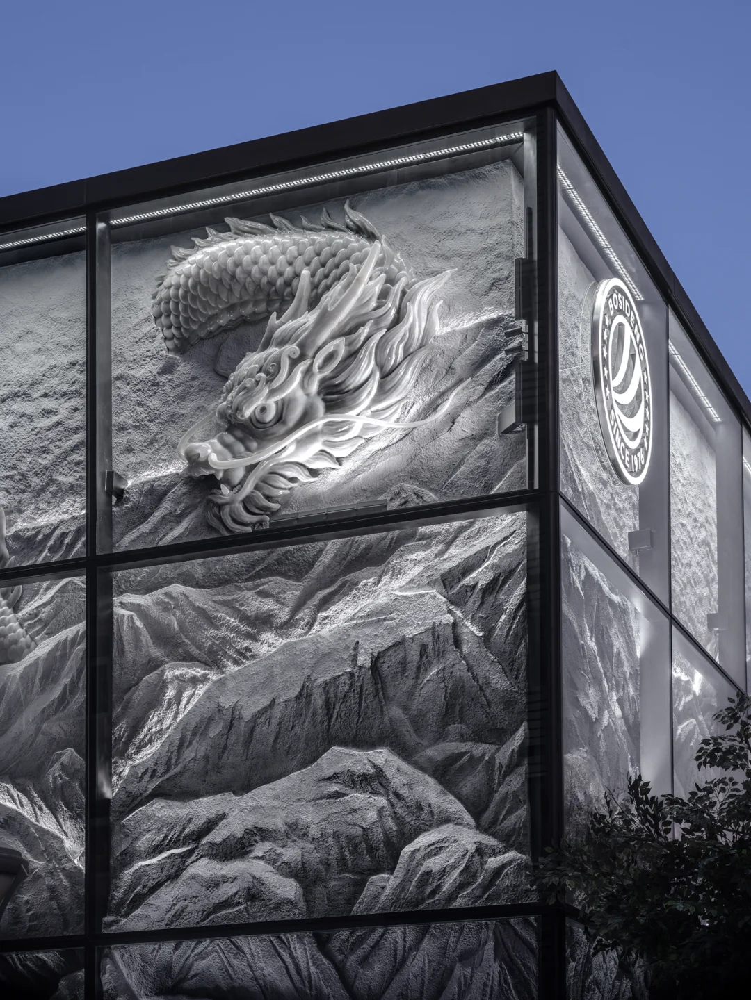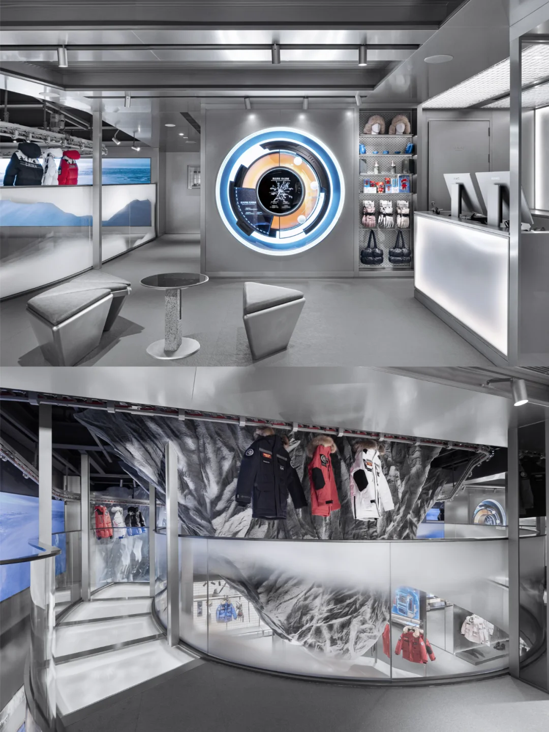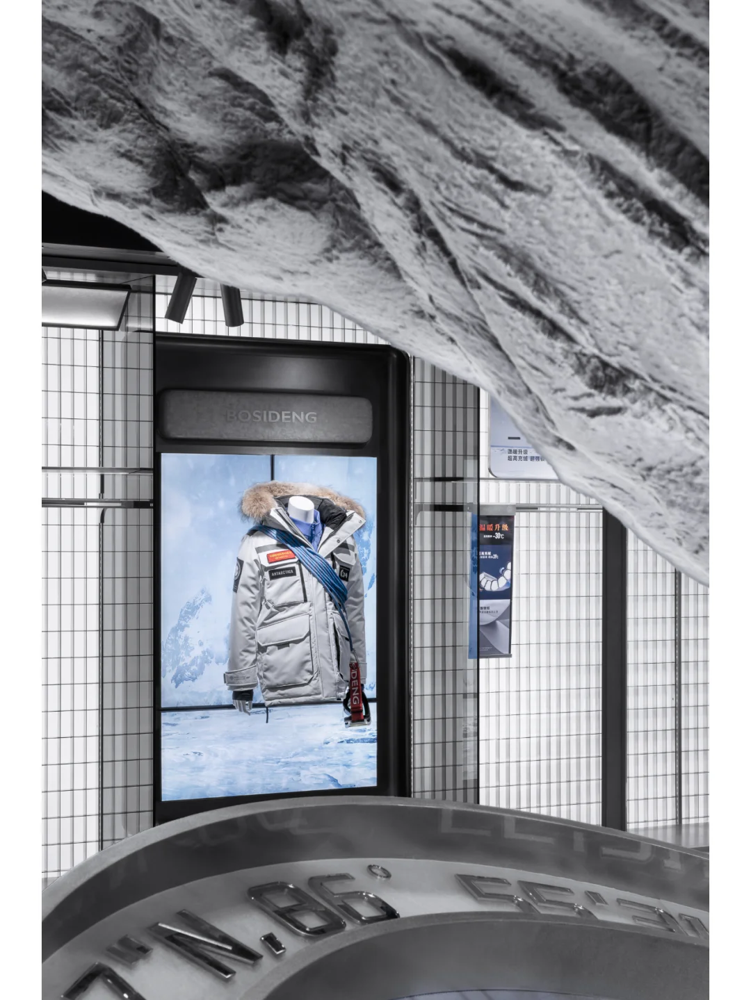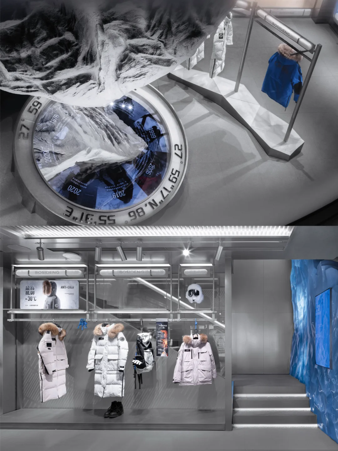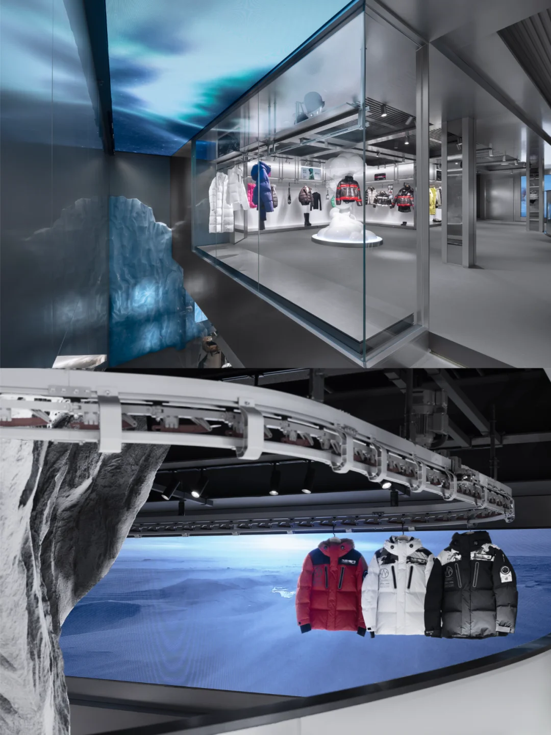 门店依循独特的设计逻辑,以“峰行无阻,逐梦巅峰”为主题,通过四个篇章构建故事线,重新解读波司登品牌精神与视觉符号,演绎为“冰雪之龙”与“三极”元素,打造一个未来与极限交汇的零售空间。