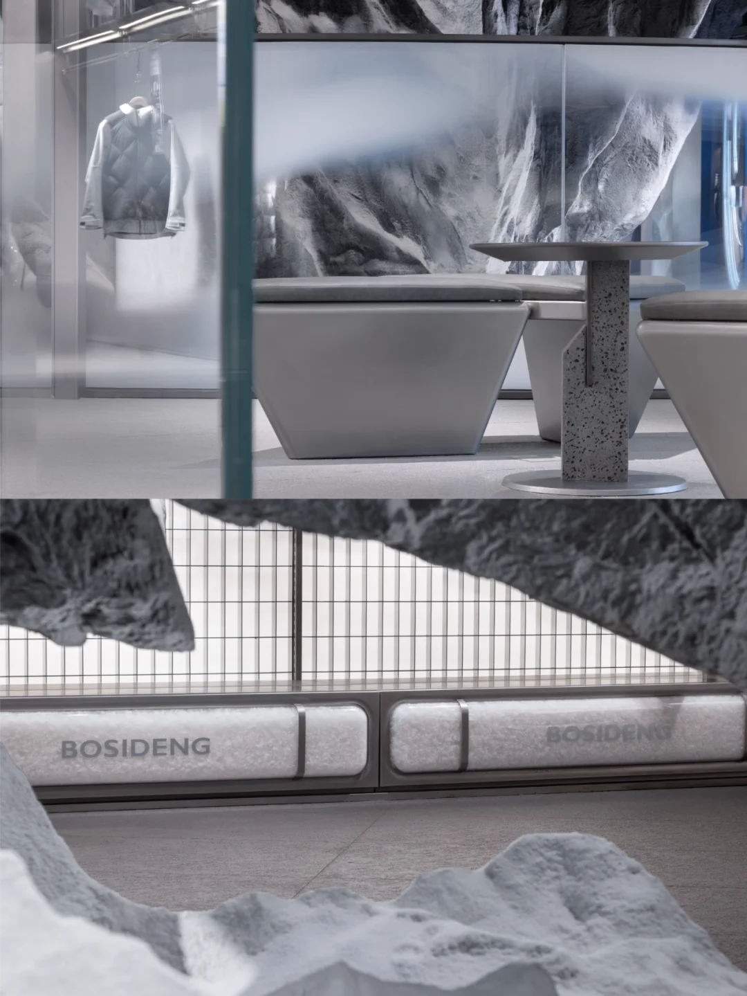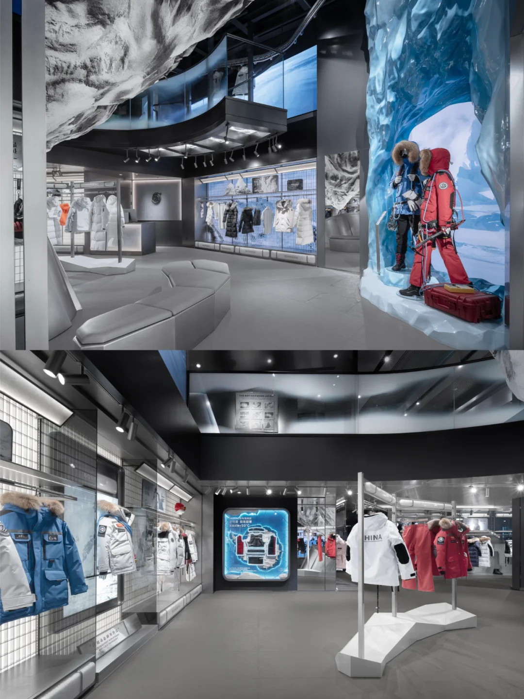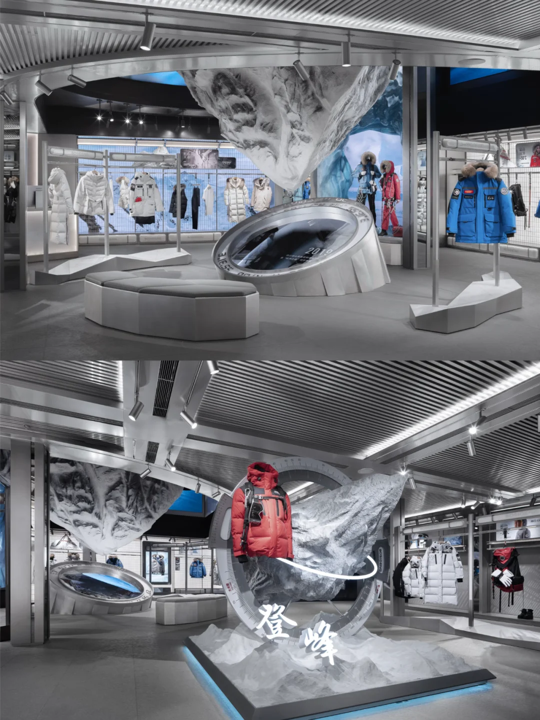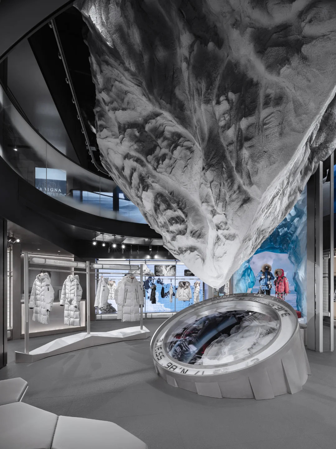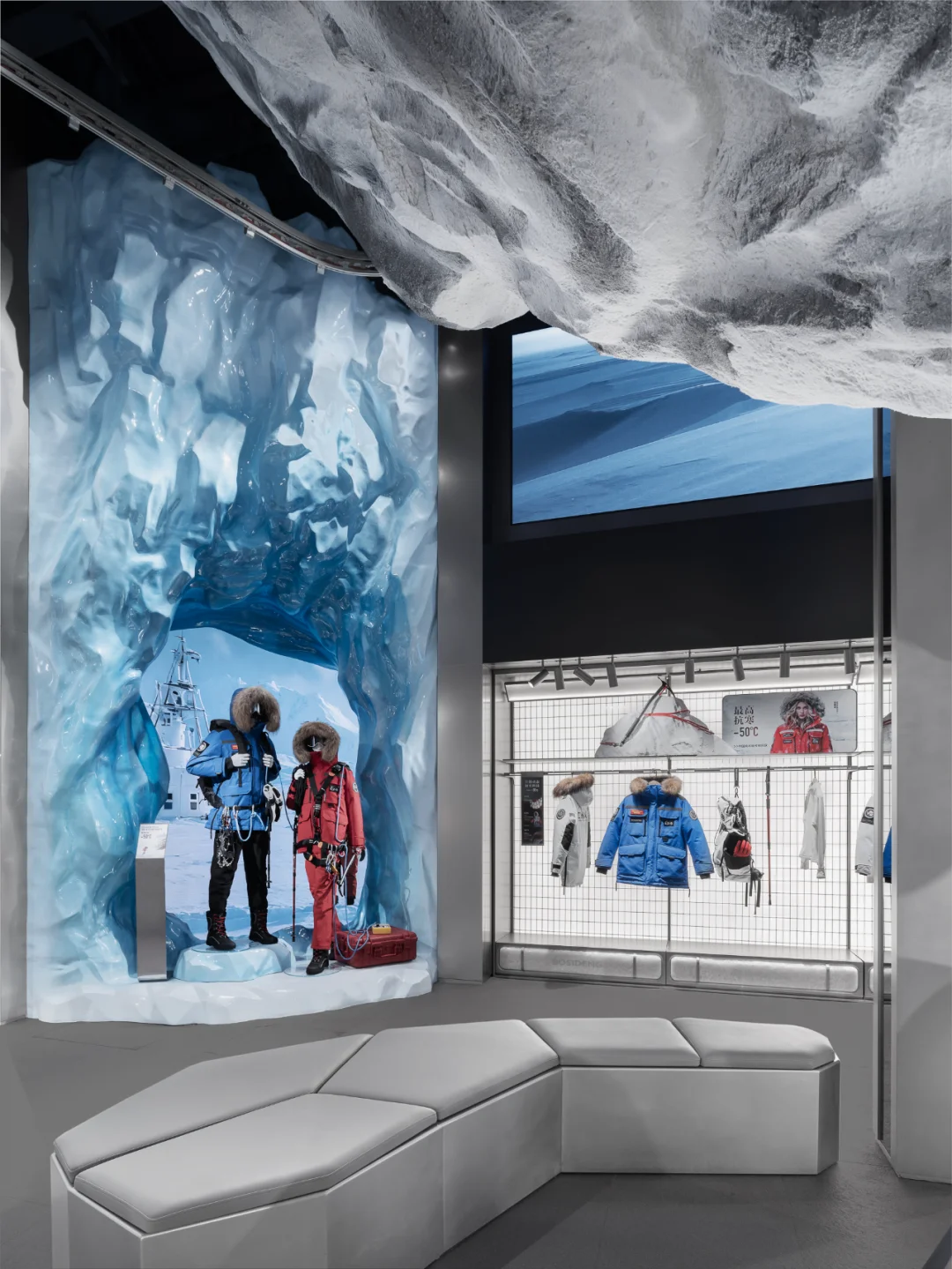 室内设计延续了外立面的语言符号,以珠峰、南北极等自然景观为主题,通过富有层次感的布局将这些元素有机融合,营造出亲近自然、探索未知的空间氛围,引领消费者进入一片原始的冰雪世界。