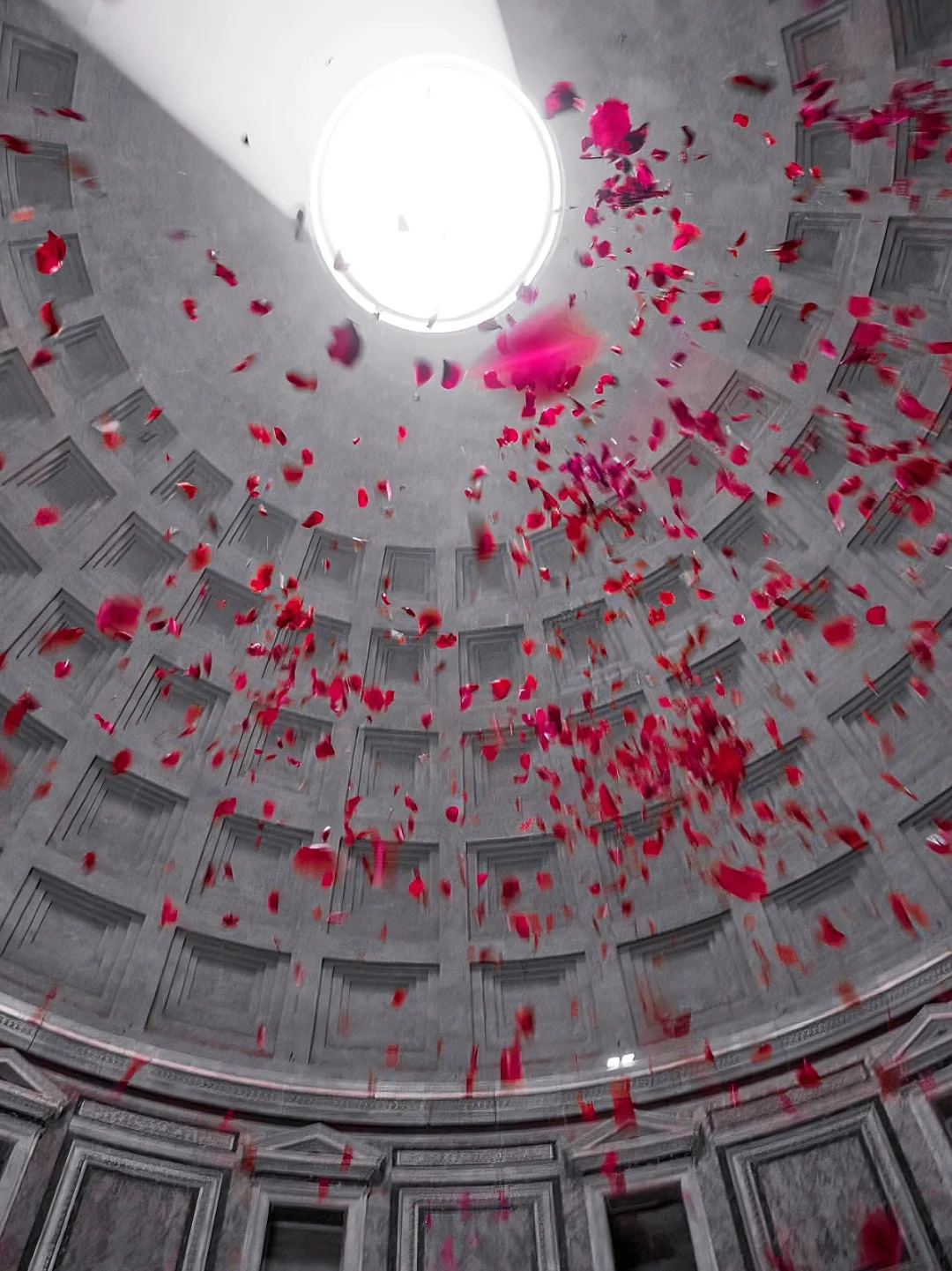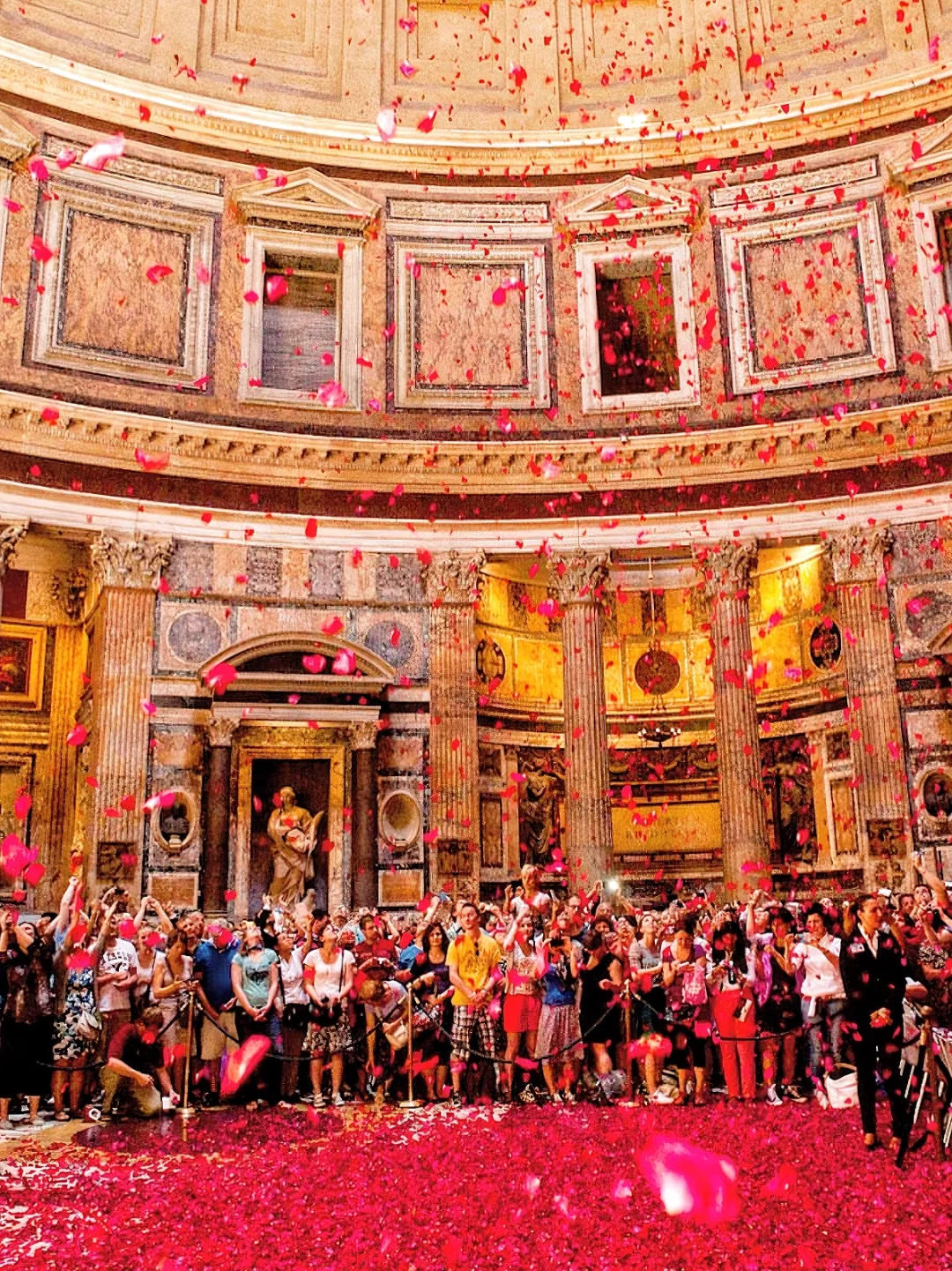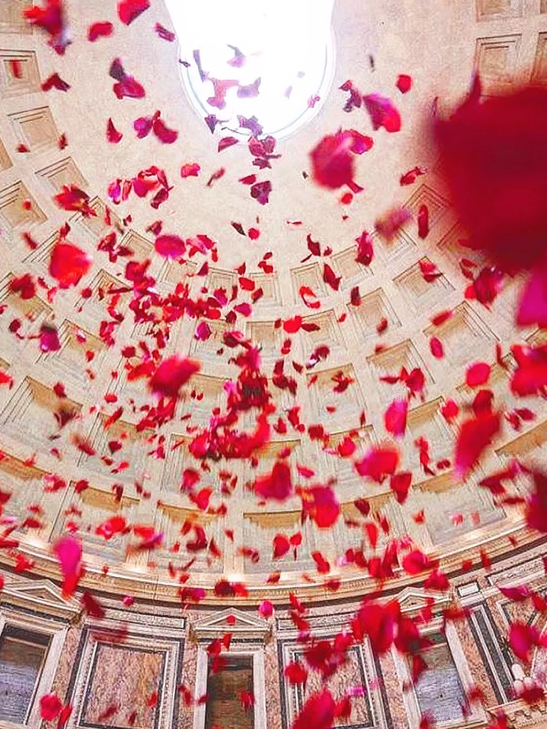 届时大约六名消防员会爬到圆顶的顶部,通过万神殿的圆孔洒下万千红色玫瑰花瓣,大教堂里下着玫瑰花瓣雨,直到整个地板都被红色的花瓣覆盖。