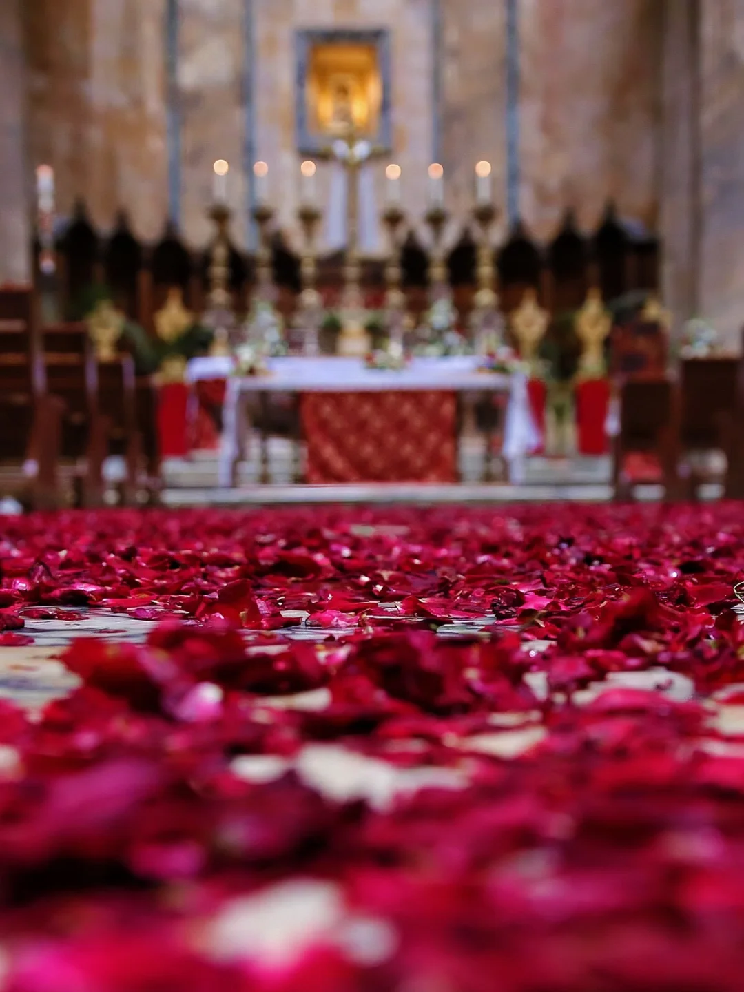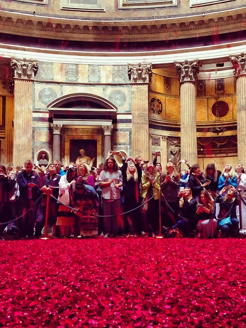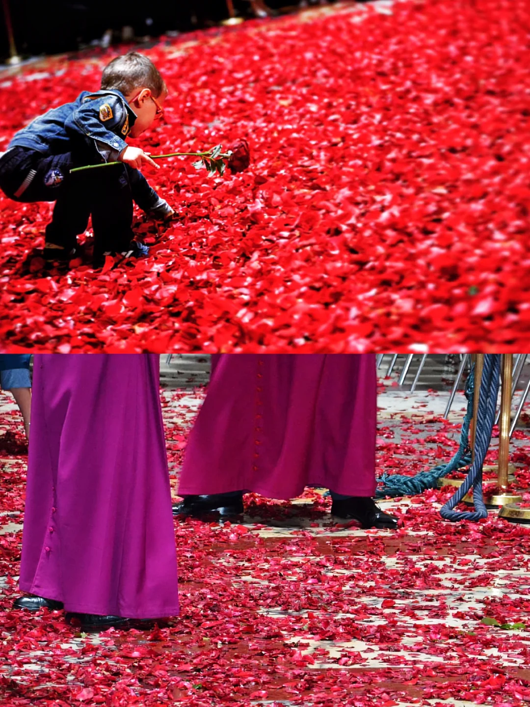 届时大约六名消防员会爬到圆顶的顶部,通过万神殿的圆孔洒下万千红色玫瑰花瓣,大教堂里下着玫瑰花瓣雨,直到整个地板都被红色的花瓣覆盖。