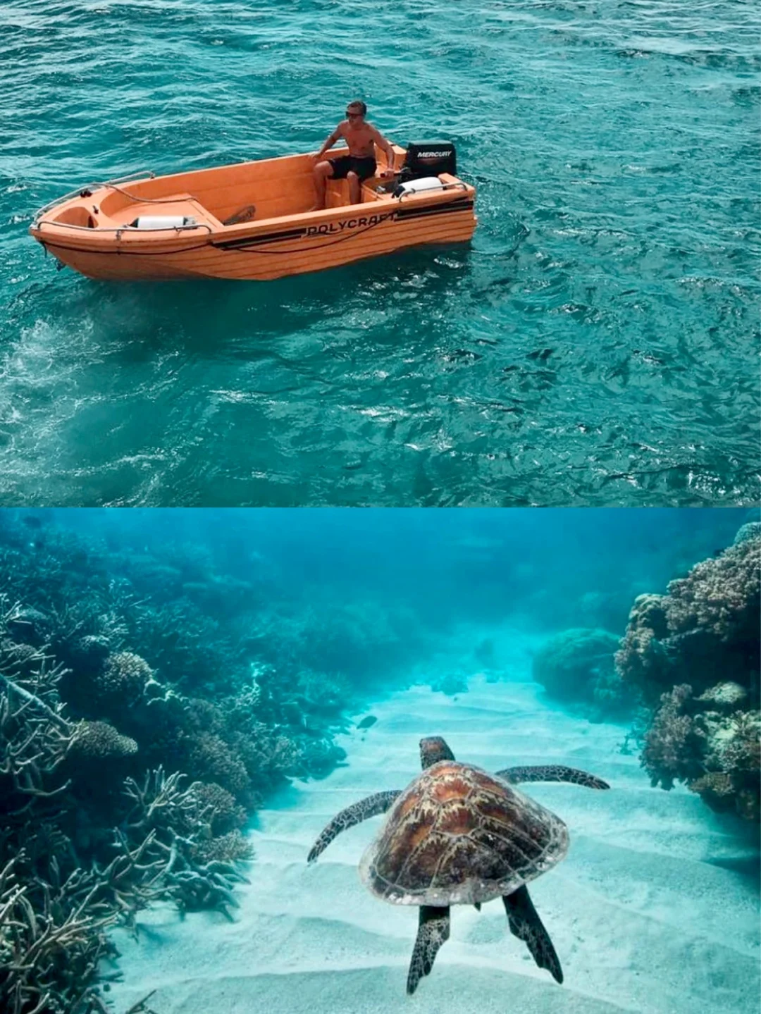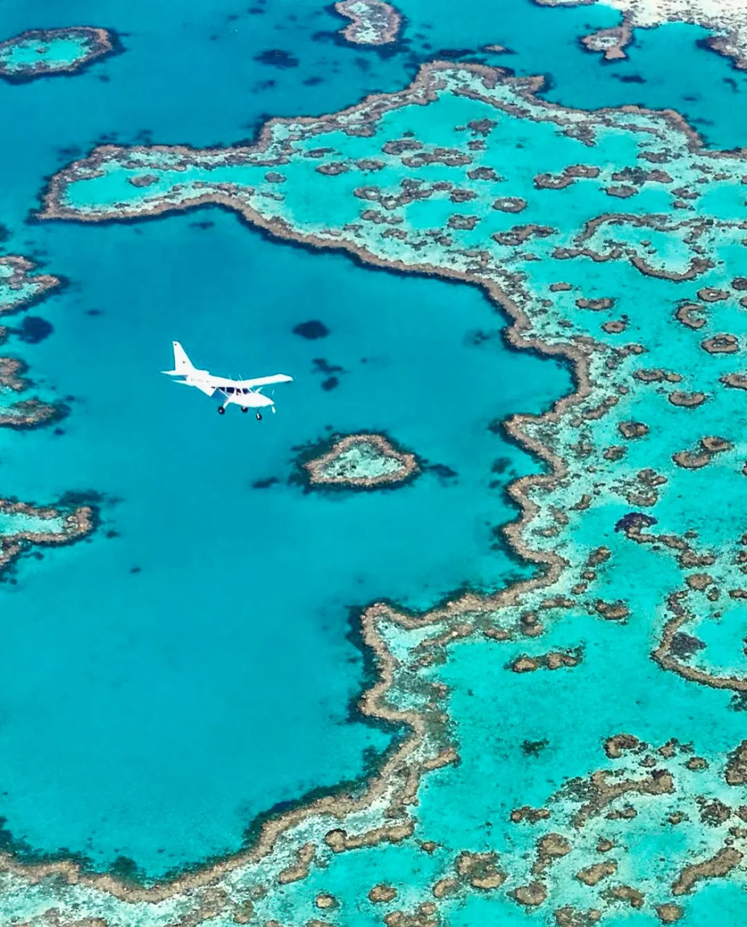 观光飞机是性价比最高的一个。每天有好几班,可以选择1小时和25分钟飞行,但是25分钟是不包含去心形礁的,为了看心形礁当然选择1小时飞行啦。机长会在飞行过程中进行介绍,即将到心形礁的时候还会倒计时,会左边右边各飞一次,让左右两排的人都能看清楚。是众珊瑚中的一个小心形,机长不提醒恐怕就要错过了呢。虽然之前在图片上看到了很多次,但真正在飞机上俯瞰时,还是特别震撼和激动 。