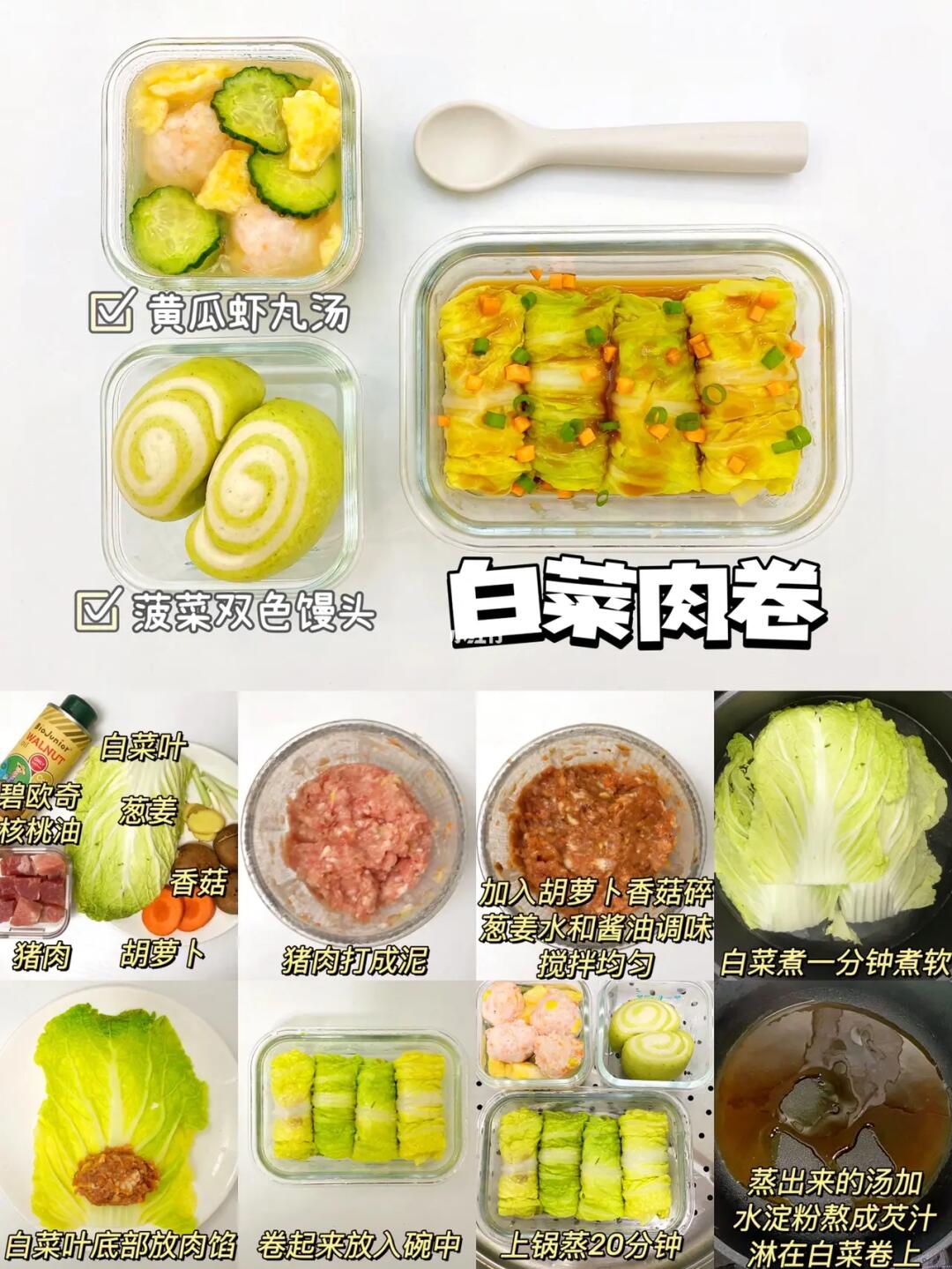 ☑️白菜肉卷+黄瓜虾滑汤+菠菜双色馒头