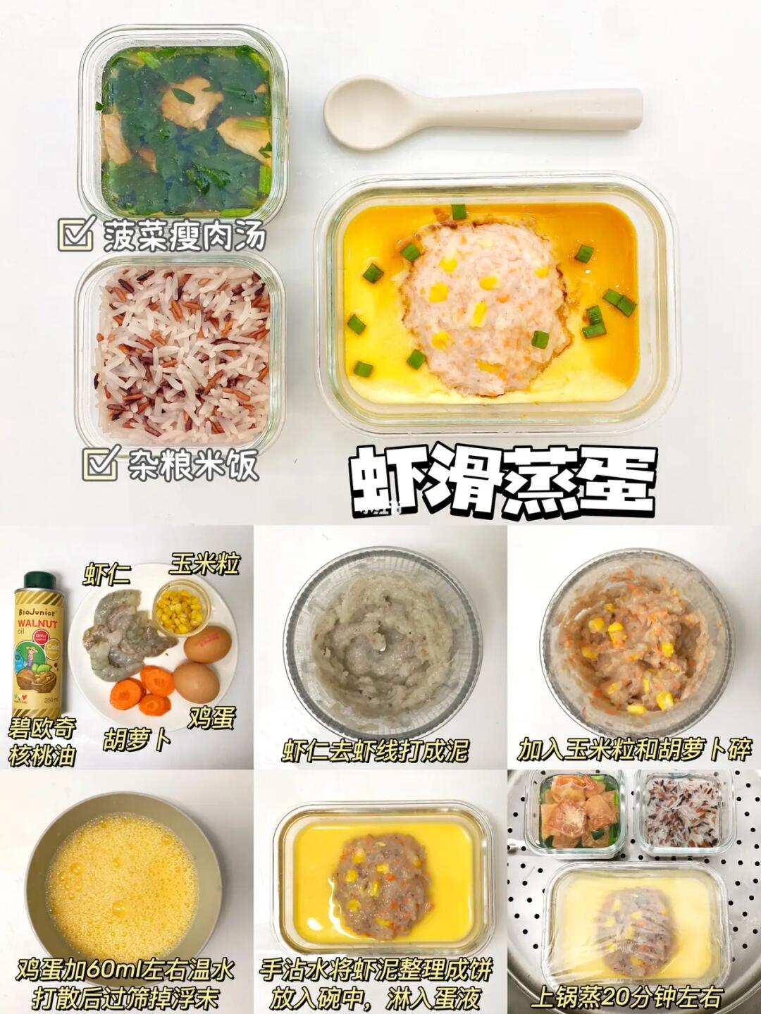 🦐虾滑蒸蛋做法:虾仁去掉虾线放破壁机打成泥,加入炒熟的玉米粒和胡萝卜碎,充分搅拌上劲,放入碗中。两个鸡蛋加60ml左右温水打散,过滤到装虾滑的碗中,盖上保鲜膜扎小孔,上锅蒸20分钟。出锅淋上几滴碧欧奇核桃油和酱油。