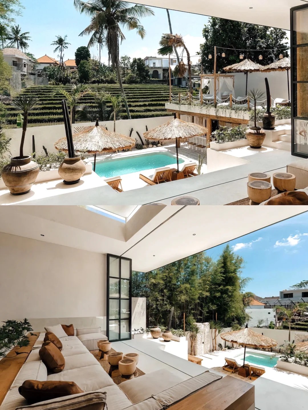 ▪️ 宽敞的开放式起居区超舒服,还拥有俯瞰稻田的私人游泳池和日光浴床,太惬意了