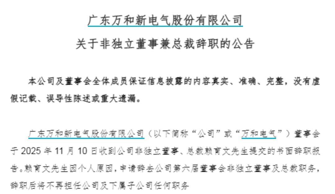 11月10日晚间,万和电气公告称,公司总裁赖育文先生因个人原因,申请辞去公司第六届董事会非独立董事及总裁职务,辞职后将不再担任公司及下属子公司任何职务。