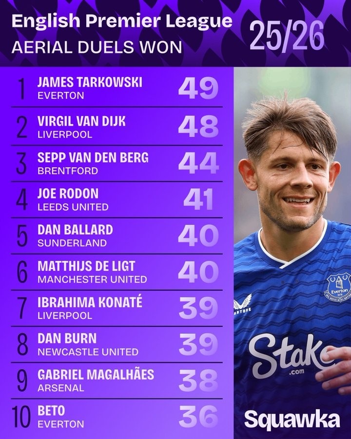 直播吧11月11日讯英超联赛已经进行了11轮,squakwa也统计了本赛季英超空中成功对抗次数,塔科夫斯基力压范戴克居首。