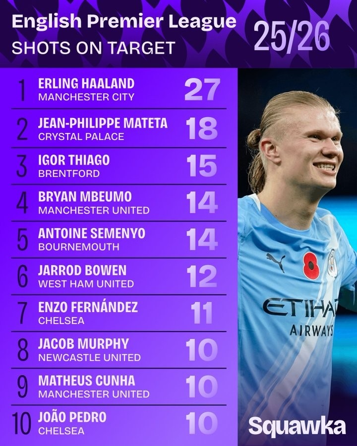 直播吧11月11日讯英超联赛已经进行了11轮,squakwa也统计了本赛季英超射正次数,哈兰德断崖领跑。