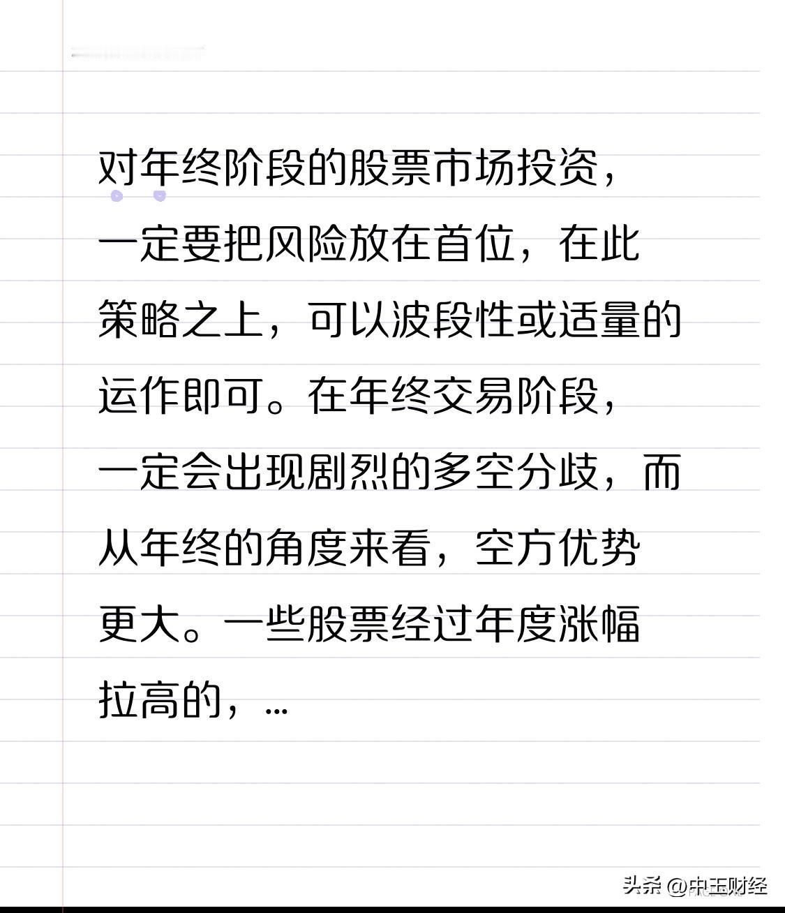 【A股今天】在年终阶段进行股票市场投资时,务必要将风险置于首位。基于这一策略,进行波段性操作或适量交易即可。 年终交易阶段,市场必然会出现激烈的多空分歧。从年终整体形势来看,空方占据更大优势。 部分经过年度涨幅拉高的股票,存在机构彻底获利兑现的可能性。这会导致许多股票从高位大幅杀跌,有些股票看似跌幅较大,但实际上机构的成本极低。 当然,也有一些机构年度盈利有限,甚至仍处于亏损或微利状态。在年终阶段,它们也想翻本或实现盈利增加,所以部分品种存在一定的波动机会。 总之,年终阶段的交易应在保住胜利果实的前提下开展。可以考虑用盈利部分进行投资,其余本金暂时不动,采取战略观望的策略。在回避品种风险方面,一定要远离那些业绩极差、有较大违规违法嫌疑的股票!股票价值分析 股票投资价值 股票潜力分析 股票入场时机 一股票建仓时机