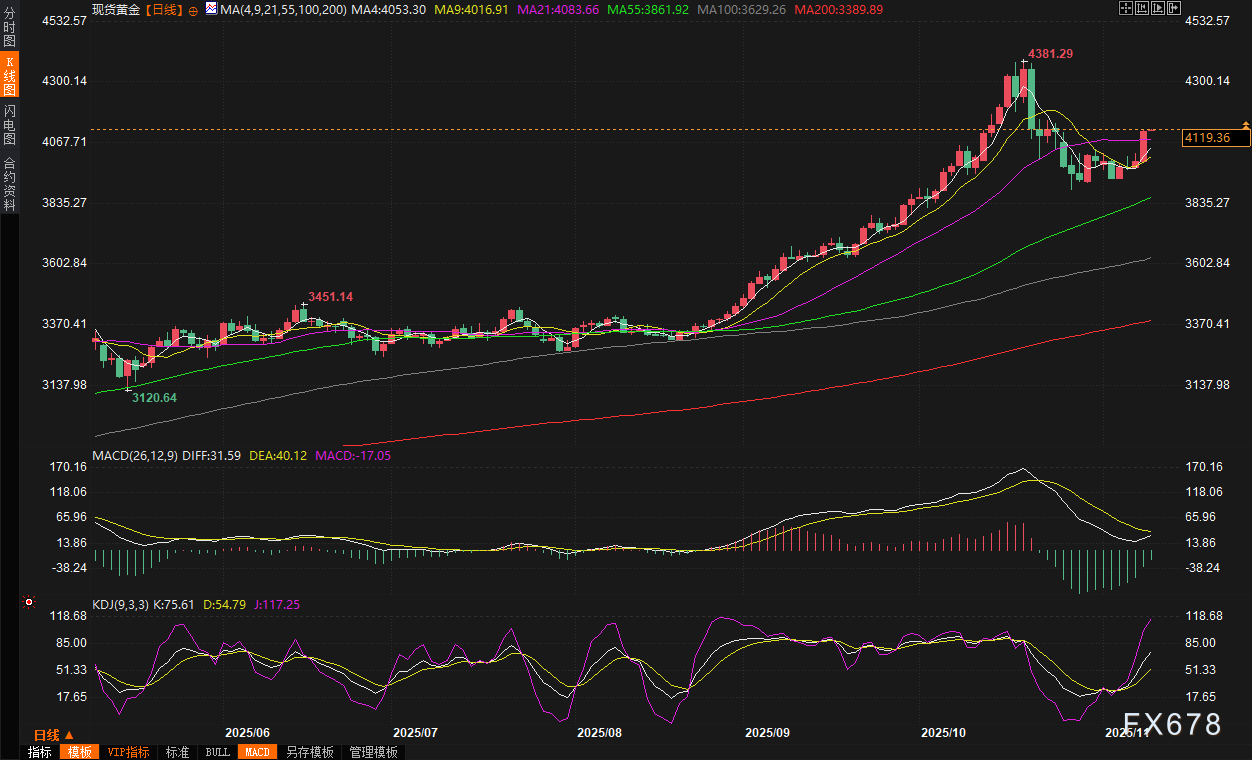 汇通财经APP讯——周二(11月11日)亚市早盘,现货黄金延续隔夜涨势,一度触及4120关口,刷新近两周高点。周一现货黄金大涨2.85%,收报4115美元附近,这是自10月23日以来的最高收盘价。现货白银更是不甘示弱,涨幅超过4%,创下10月21日以来最高水平。在美国经济数据疲软与美联储降息预期升温的双重推动下,黄金作为非孳息资产的避险魅力全面爆发。