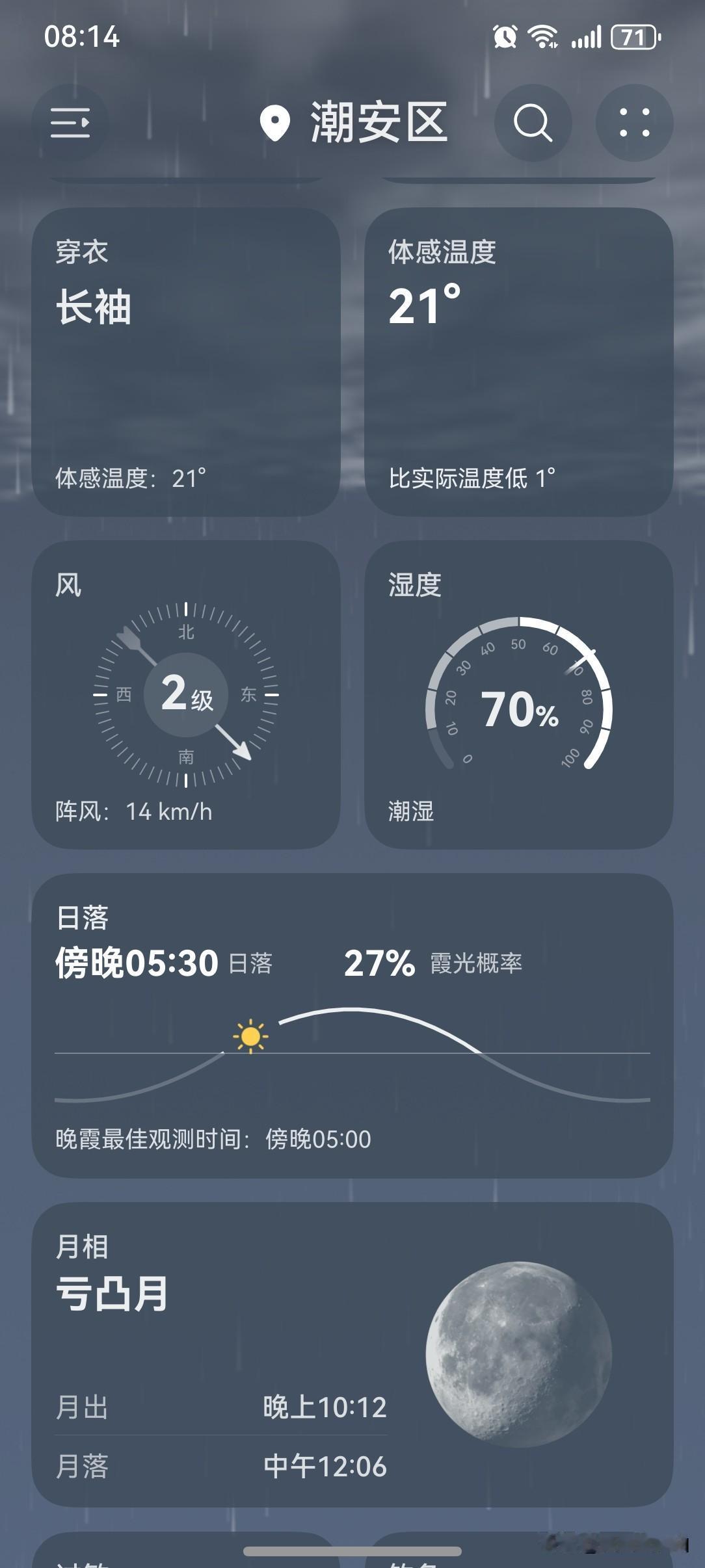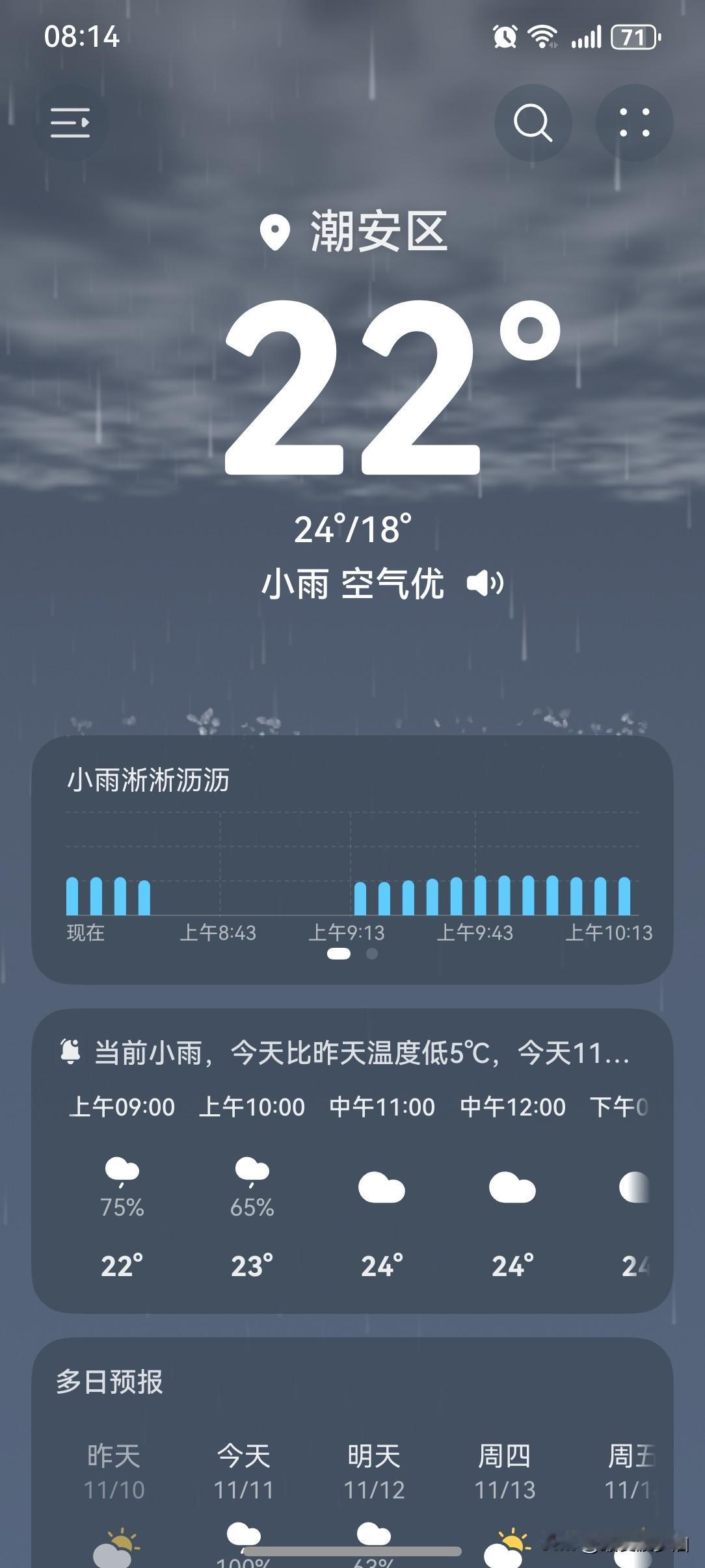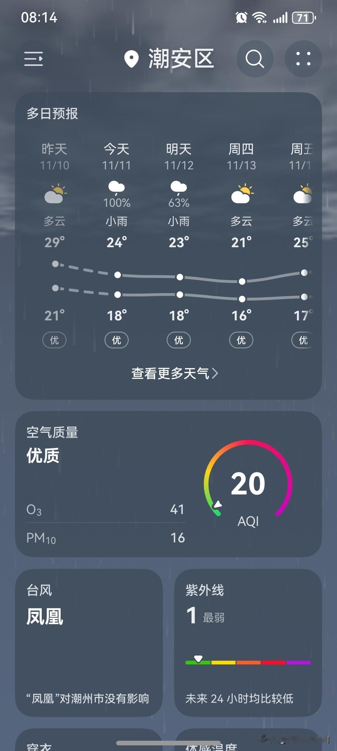 广东:降温啦!降温啦! 受弱冷空气影响, 广东气温小幅下降。 11~12日, 受台风"凤凰"外围云系影响, 东部偏东市县有小到中雨局部暴雨, 粤北偏北市县最低气温达14℃。 另外, 今年第26号台风“凤凰”已进入我国24小时台风警戒线, 或于12日前后登陆台湾沿海。 未来几天, 台湾、福建、广东、浙江等局地或遭大暴雨甚至特大暴雨, 华东、华南沿海将有持续性大风, 上述地区需持续做好防台风措施。 今天(11日), 潮州有阵雨, 气温18~24℃, 此刻气温22℃, 体感温度21℃。 潮州从昨天开始风力逐渐变大, 早上的风更大, 雨水也来了! 一阵一阵地下, 倒也不大。 气温咔咔地下降, 早上出门的小伙伴们! 需要注意添衣保暖, 别让感冒病毒有机可乘! 今天的天气, 就目前看来, 还是非常不错的! 气温下降, 凉爽了很多, 舒适度拉满, 这就很秋天了! 这样的天气, 必须给个五星好评! 如此天气! 元芳,你怎么看? [捂脸][我想静静][捂脸][我想静静][捂脸][我想静静][捂脸][我想静静] 晒图笔记大赛