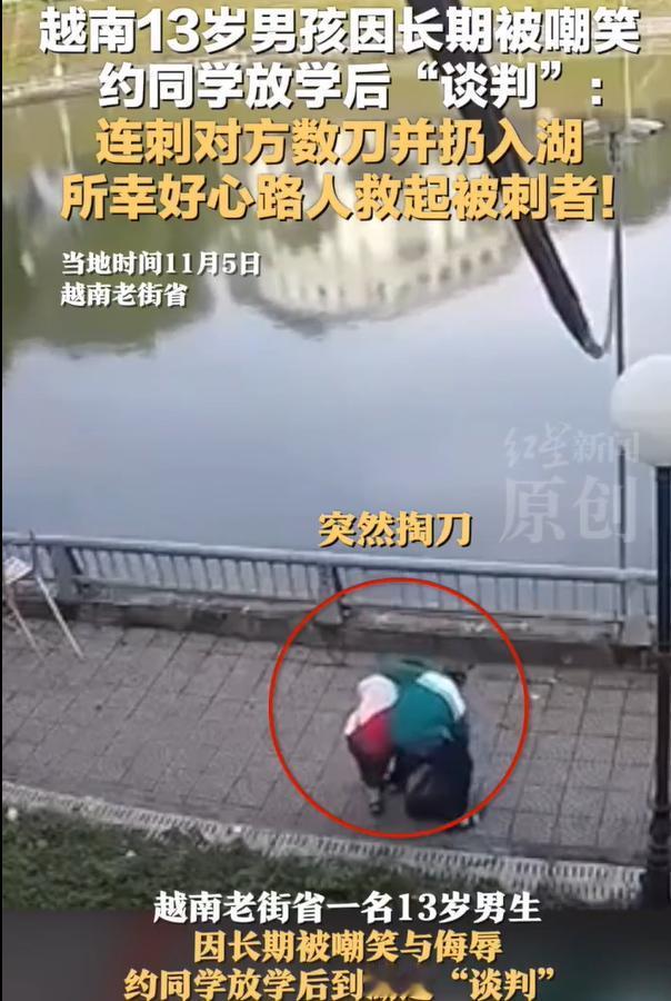 13岁男孩因被长期嘲笑连刺同学数刀,并将其扔入池塘,当时看到这个视频我就觉得很诧异,我以为是我们某个地方发生的事情,原来是发生在越南老街。 行凶的男孩13岁,被刺的同学年龄也是相仿的,并不是网上说的欺负年幼的8岁男孩,而且这里面有个前提,就是13岁男孩长期被嘲笑,且请求被刺者不要再嘲笑他了,可是被刺男孩仍然执迷不悟,所以才发生了视频里的事情,幸好被刺的同学被路人搭救,才没有造成严重的后果,而13岁男孩也因为年龄问题没有被追究法律责任。 这个事情背后,一方面是13岁男孩的做法一定是不提倡的,幸亏没事儿,真发生了不幸,就毁掉了两个家庭和两个孩子的未来;另一方面也要看到,有些人长期嘲笑、羞辱他人,亦是不可取的,长期嘲笑和羞辱他人,其实是一种霸凌。 在现实生活中,很多人都是欺软怕硬,软的不行,就只能靠硬的解决问题,这也是对霸凌者的反击。因为这件事情发生在两个未成年之间,很多话不好说,但还是提醒孩子的家长管好自己的孩子,不欺负别人,但也不能让别人欺负。