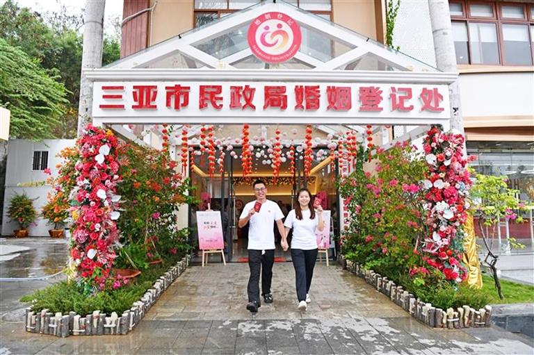 市民政局“520集体婚礼”在鹿回头婚俗改革示范点举办。图为新人在领证后走出婚姻登记处。(资料图片)记者李学仕摄