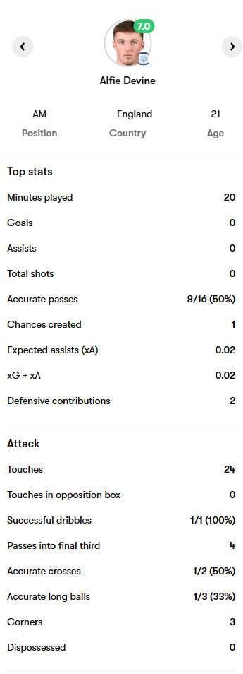 英冠:普雷斯顿 1-1 米尔沃尔,德维恩70分钟替补登场。