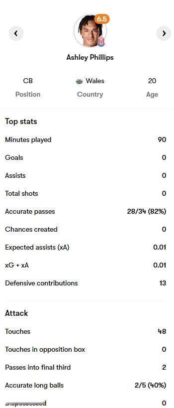 英冠:斯托克城 0-1 考文垂,菲利普斯打满全场。