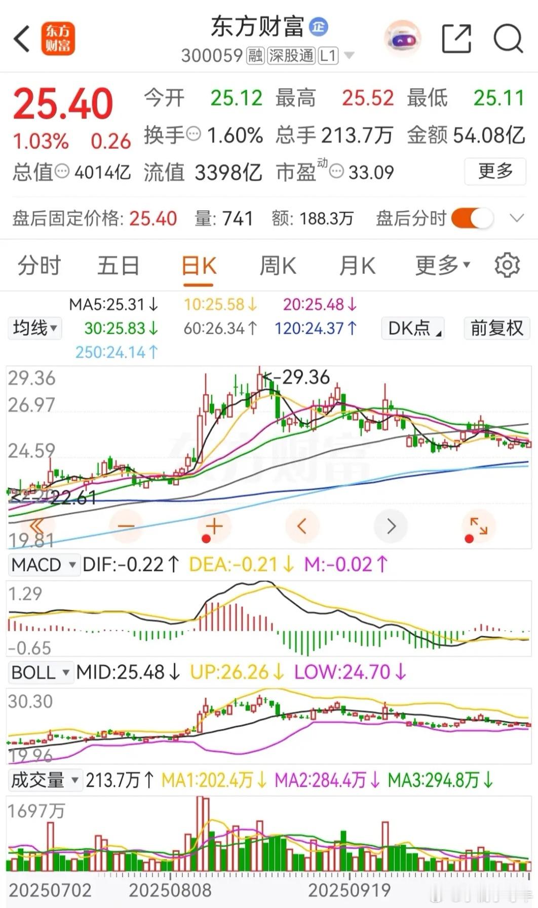 东方财富和中信证券,今天都是低开高走,收盘时涨幅一样,涨了 1.03%,且都被主力资金净买入。东方财富今天早盘低开后震荡走高,午后盘中冲高回落后继续震荡上行,收盘时股价上涨了约1.03%,报价为25.40元。在资金流向上被主力资金净买入了1.9854亿元,近五个交易日则是被主力资金合计净卖出了6.2993亿元。但从走势上看,日线级别上股价依然受到均线的压制。