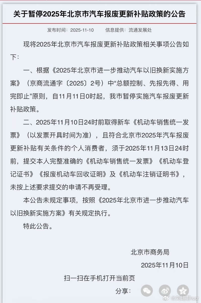 北京暂停了汽车报废补贴今年应该不能有了,明年有没有不知道了[允悲]没领到补贴的车