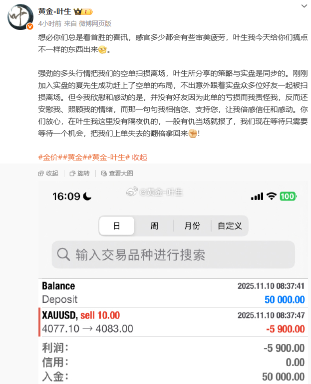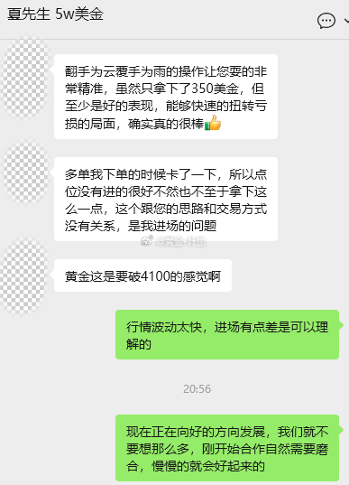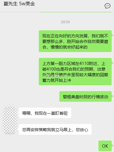 下午刚刚加入的夏先生虽然遭遇首单的亏损,但并未降低对叶生的信任和认可,在后续的布局当中经过我们密切的配合,反手在4085附近介入多单,成功挽回前期两张空单的损失,多头如期强势的行情回撤空间,而想要逆势狙击的机会只有等待美盘,行情上冲时并为出现较大幅度的回撤蓄力,事出反常必有妖美盘时段不会回调明天也会回调,只有回调蓄力后才有机会冲的更高。微博分享的策略均为实盘策略,叶生分享实盘的操作记录出来,一是告诉你们,不要因为一时的得失,就否定一位导师,二是告诉你们,叶生团队玩的就是真实,单子怎么样我们就呈现什么样子。