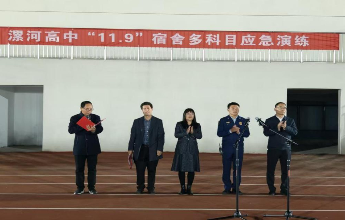 漯河市高级中学党委副书记、校长郭爱红,党委委员、副校长柳荣军、丁爱军,西城区消防救援大队丹江路消防救援站站长周凯等领导嘉宾全程观摩并指导演练;活动由学校政教处主任胡卫党主持,西校区中层干部、高一年级一部全体住宿生、志愿者教师、宿舍安保人员及宿管员等一千余人共同参与。