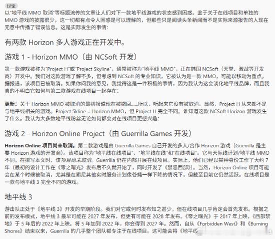 爆料称目前正有两款《地平线》世界观下的在线游戏同步研发中。NCSoft打造的版本将更接近MMO形态,玩家可共同探索世界、狩猎机械巨兽、完成协作任务,整体概念与《怪物猎人》非常相似。而Guerrilla Games则同时在推进另一款更保留系列经典玩法与叙事传统的多人游戏项目。