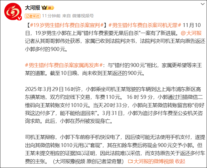 据大河报,“19岁男生错付车费自杀”案宣判,司机无罪:11月10日,19岁男生小郭在上海“错付车费索要无果后自杀”一案有了新进展。记者从其哥哥郭伟处获悉,家属已收到法院判决书,法院判决司机王某向原告返还小郭多付的900元。