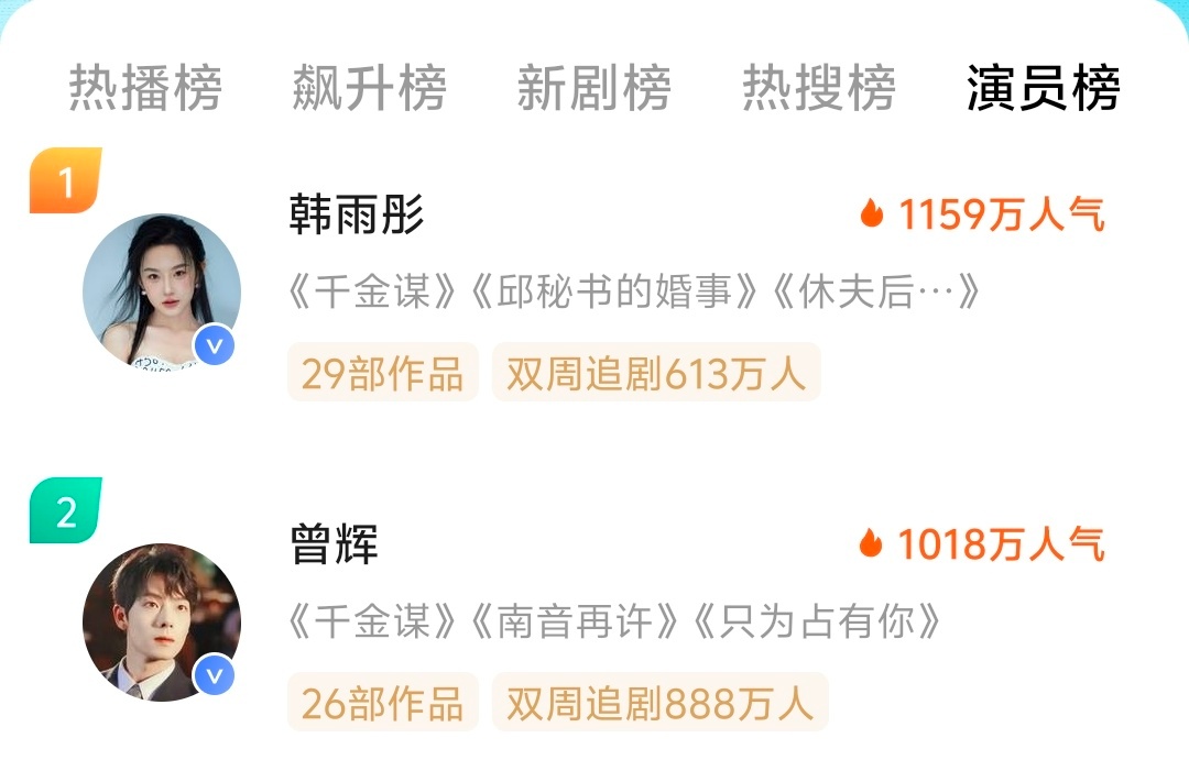 今天热度依旧破亿,妞妞辉哥分别登顶演员榜