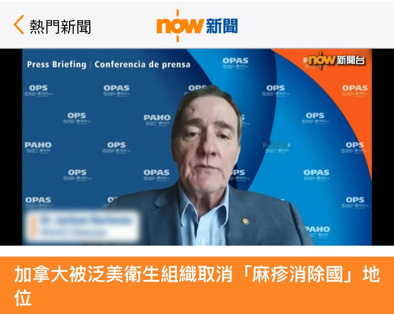 【观世界】【加拿大被泛美卫生组织取消「麻疹消除国」地位】 泛美卫生组织表示,由于加拿大麻疹疫情传播出现超过一年,所以已正式知会加拿大取消其麻疹消除国地位。 泛美卫生组织主管巴尔博萨表示,组织上周召开会议,评估美洲区域各国流行病学情况,认为麻疹已重新在加拿大出现地方性传播,已正式通知加拿大失去「麻疹消除国」地位。 加拿大在1998年宣布成功消除麻疹,但自去年10月,多地再次爆发大规模疫情,艾伯塔省、安大略省及魁北克省等地均发现麻疹病例。今年截至10月,共录得5138宗个案,确诊病例有4777,361为疑似个案。艾伯塔省和安大略省各有一宗死亡病例。 加拿大 麻疹 美国麻疹疫情卷土重来