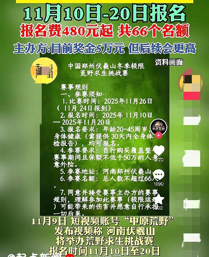 大新闻大新闻 伏羲山荒野求生赛, 看着刺激实则满是槽点!私人团队办赛还在审批,收着480元起的报名费,号称5万+奖金,还投放鸡鸭让选手捕猎,这算是剧本还是野营? 那边张家界赛事刚曝特种兵饿到暴瘦退赛,这边又来跟风割韭菜。真正的荒野求生拼的是智慧,不是靠饿肚子博眼球,更不是付费就能直通半决赛的“特权游戏”。 赛事连审批都没敲定,安全保障全靠口头承诺,却逼着选手签直播协议,这其实就是拿“生存挑战”当幌子蹭流量吧。好像真的变了质。 你觉得这种没批下来就招生的赛事靠谱吗?你愿意为这种“剧本化求生”买单吗?荒野求生比赛 极限荒野求生 七星山荒野挑战 成都荒野求生赛 荒野创造营