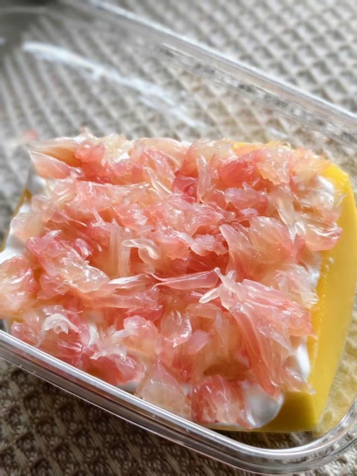 用半个芒果做底,中间涂上干噎酸奶或者希腊酸奶,上面再撒一点杨枝甘露里常见的柚子果肉和西米,就变成了可以拿着吃的固体版杨枝甘露。