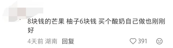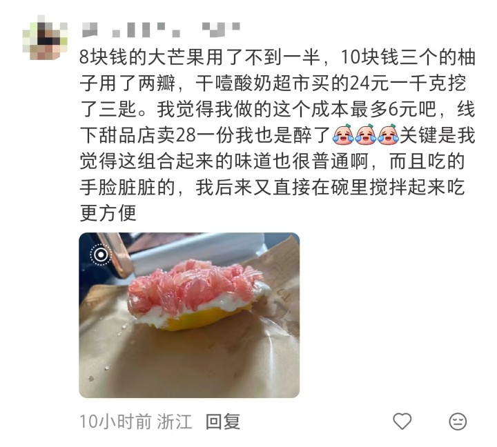 有网友晒过自己做的版本,成本在8元以下,还有网友算了一笔账,即使去商超购买原材料,自己买干噎酸奶+单个柚子+单个芒果,总价也不会超过25元,一次做两个,大概一个原材料成本在12.5元。
